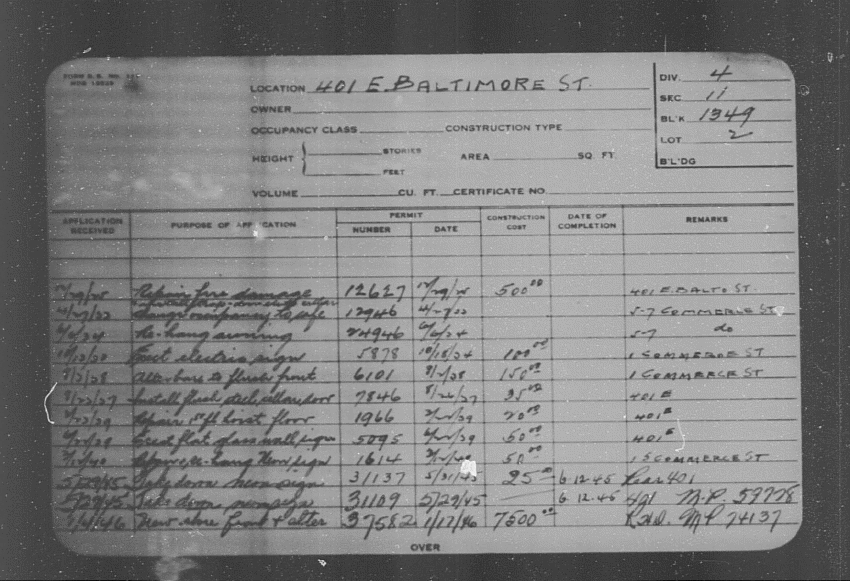 Baltimore City Archives (Baltimore City Property Building Permits) brg48_bca656-3260 Enlarge and print image (159K)      |