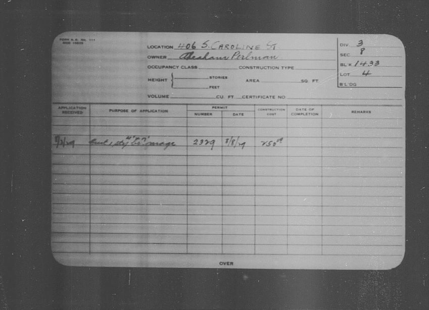 Baltimore City Archives (Baltimore City Property Building Permits) brg48_bca657-1109 Enlarge and print image (139K)      |