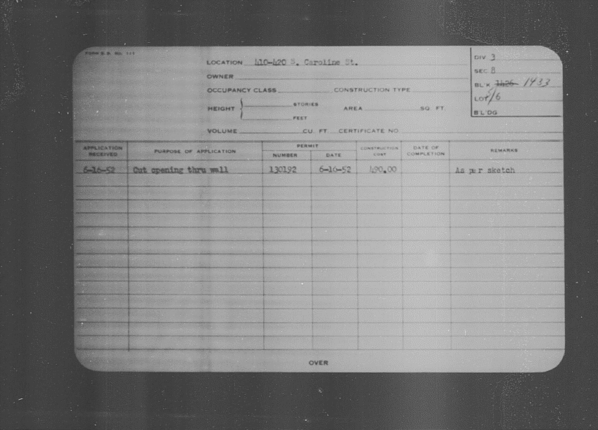 Baltimore City Archives (Baltimore City Property Building Permits) brg48_bca657-1110 Enlarge and print image (127K)      |