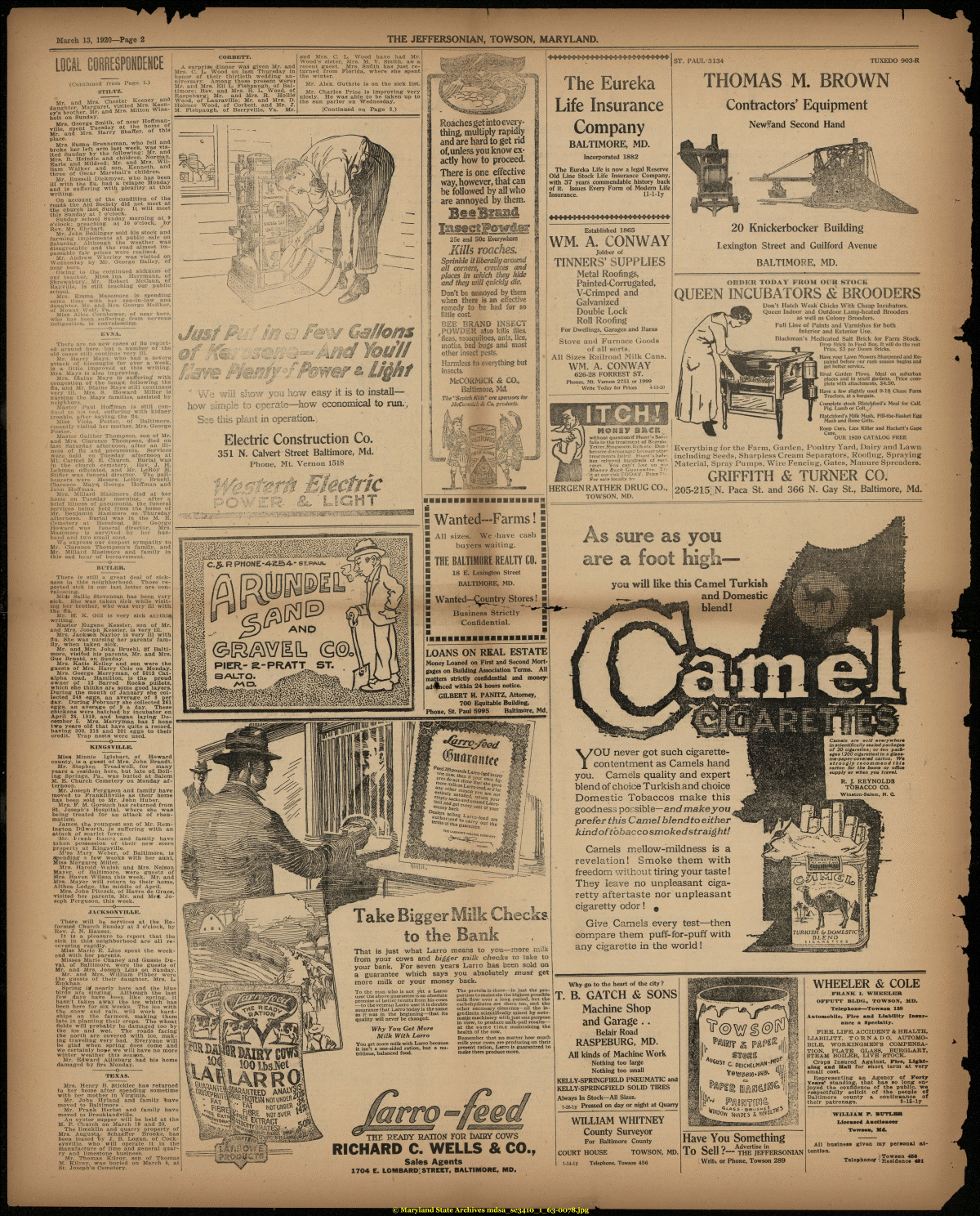 | March 13, 1920—Page 2 THE JEFFERSONIAN, TOWSON, MARYLAND. LOCAL CORRESPONDENCE (Continued from Page 1.) STIL.TZ. Mr and Mrs. Chester Keeney and daughter, Margaret, visited Mrs. £een-ey'" brother, Mr. and Mrs. Milton Wine-holt on Sunday. Mrs. George Smith, of near Hoffman-vllle, spent Tuesday at the home Mr. and Mrs. Harry Shaffer, of this place. Mrs. Susan Brenneman, who fell and broke her left arm last week, was visited Sunday by the following: Mr. and Mrs. R. Heindle and children, Norman, Earle and Mildred; Mr. and Mrs. William Walker and son, Kenneth, and three of Oscar Marshall's children. Mr. Russell Dickmyer, who has been ill with the flu, had a relapse Monday and is suffering with pleurisy at this writing. On account of the condition of the roads the Aid Society did not meet at the church last Sunday. It will meet this Sunday at 7 o'clock. Sunday school Sunday morning at 9 o'clock; preaching at 10 o'clock, by Rev. Mr. Ehrhart. Mr. John Bollinger sold his stock and farming implements at public sale on Saturday. Although the weather was disagreeable and the road almost impassable fair prices were realized. Mr. Andrew Wherley was visited on Wednesday by Mr. George Bailey, of near here. Owing to the continued sickness of our teacher, Missi Ina Herrmann, of Shrewsbury, Mr. Robert McCann, of Rayville, is still teaching our public school. Mrs. Emma Masemore is spending some time with her son-in-law ana daughter, Mr. and Mrs. George Heilker, of Mount Wolf, Pa. Miss Alice Cornbower, of near here, who has been suffering from nervous indigestion, is convalescing. -------------o------------- EVM, CORBETT. A surprise dinner was given Mr. and Mrs. C. L. Wood on last Thursday in honor of their thirtieth wedding anniversary. Among those present were: Mr. and Mrs. Eli L. Pishpaugh, of Baltimore; Rev. and Mrs. R. L Wood, of Raspeburg; Mr. and Mrs. R. Hollie Wood, of Lauraville; Mr. and Mrs. D. Holmes Wood, of Corbett, and Mr. J. M. Pishpaugh, of Berryville, Va. Mr. and Mrs, C. L. Wood have had Mr. Wood's sister, Mrs. M. V. Smith, asj a recent guest. Mrs. Smith has just returned from Florida, where she spent the winter. Mr. Alex. Guthrie is on the sick list. Mr. Charles Price is improving very nicely. He was able to be taken up to the sun parlor on Wednesday. IContinued on Page 3.) There are no new cases of flu reported around here, but a number of the old cases still continue very ill. Mr. Harry Mays, who had a severe attack of hiccoughs for over a week, is a little improved at this writing. Mrs. Mays is also improving. Mrs. Blaine Mays is suffering" with congestion of the lungs', following the flu, and Mr. Blaine Mays still continues very ill, Mrs. S. Howard Miller is nursing the Mays families, assisted by neighbors. Master Paul Hoffman is still confined to his bed, suffering with kidney trouble, after having the flu. Miss Viola Poster, of Baltimore, recently visited her mother, Mrs. George Poster. Master Gaither Thompson, son of Mr. and Mrs. Clarence Thompson, died on last Saturday afternoon, after an illness of flu and pneumonia. Services were held on Tuesday afternoon at Mt. Carmel M. E. Church. Burial was in the church cemetery. Rev. J. H. Lehman officiated, and Mr. LeRoy M. Stifler was funeral director. The pallbearers were Messrs. LeRoy Bruehl, Clarence Mays; George Hoffman and John Hoffman. Mrs. Millard Masimore died at her home on Tuesday morning, after a brief illness of pneumonia, the funeral services being held from the home of Mr. Benjamin Masimore on Thursday afternoon. Burial was in the M. E. Cemetery at Hereford. Mr. George Howard was funeral director, Mrs. Masimore is survived by her husband and two small sons. We express; our deepest sympathy to Mr. Clarence Thompson's family, and Mr. Millard Masimore and family in this sad hour of bereavement. -------------O------------- BUTLER. 1 // // Roachesgetintoevery-thing, multiply rapidly and are hard to get rid of, unless you know exactly how to proceed. There is one effective way, however, that can be followed by all who are annoyed by them. - .";..' ??o? //ons hull show you how easy it is to install— how simple to operate-—how economical to run.;, See this plant in operation.; Electric Construction Co. 351 N. Calvert Street Baltimore, Md. Phone, Mt. Vernon 1518 lech ' There is still a great deal of sickness in this neighborhood. Those reported sick in our last letter are convalescing. Mia|s Sallie Stevenson has been very eick. She was taken sick while visiting her brother, who was very ill with the flu. Mr. H. K. Gill is very sick at this writing. Master Eugene Kessler, son of Mr. and Mrs. Joseph Kessler, is very ill. Mrs. Jackson Naylor is very ill with flu. She was nursing her parents' family, when taken sick. Mr. and Mrs. John Bruehl, of Baltimore, visited his parents, Mr. and Mrs. Gus Bruehl, on Sunday. Mrs. Katie Kelley and son were the guests of Mrs. Harry Cole on Monday. Mrs. George Merryman, of 5012 Cat-alpha road, Hamilton, is the proud owner of 13 Barred Rook* pullets, which she thinks are some good layers. During the month of January she collected 248 eggs, an average of 8 per day. During February she collected 261 eggs, an average of 9 a day. These chickens were hatched by incubator on April 28, 1919, and began laying December 5. Mrs. Merryman has 3 hens two years old that have quite a record, having 300, 218 and 201 eggs to their credit. Trap nestsi were used. -------------0------------- KINGSVILLE. Miss* Minnie Iglehart, of Howard county, is a guest of Mrs. John Brandt. Mr. Stephen Treadwell, for many years a resident here, but late of* Boiling Springs, Pa., was buried at Salem M. E. Church Cemetery on Monday afternoon. Mr. Joseph Ferguson and family have moved to Franklinville as their home has been sold to Mr. John Huber. Mrs. F. M. Gorsuch has returned from St. Joseph's Hospital, where she was being treated for an attack of rheumatism. James, the youngest son of Mr. Remington Dilworth, is suffering with an att