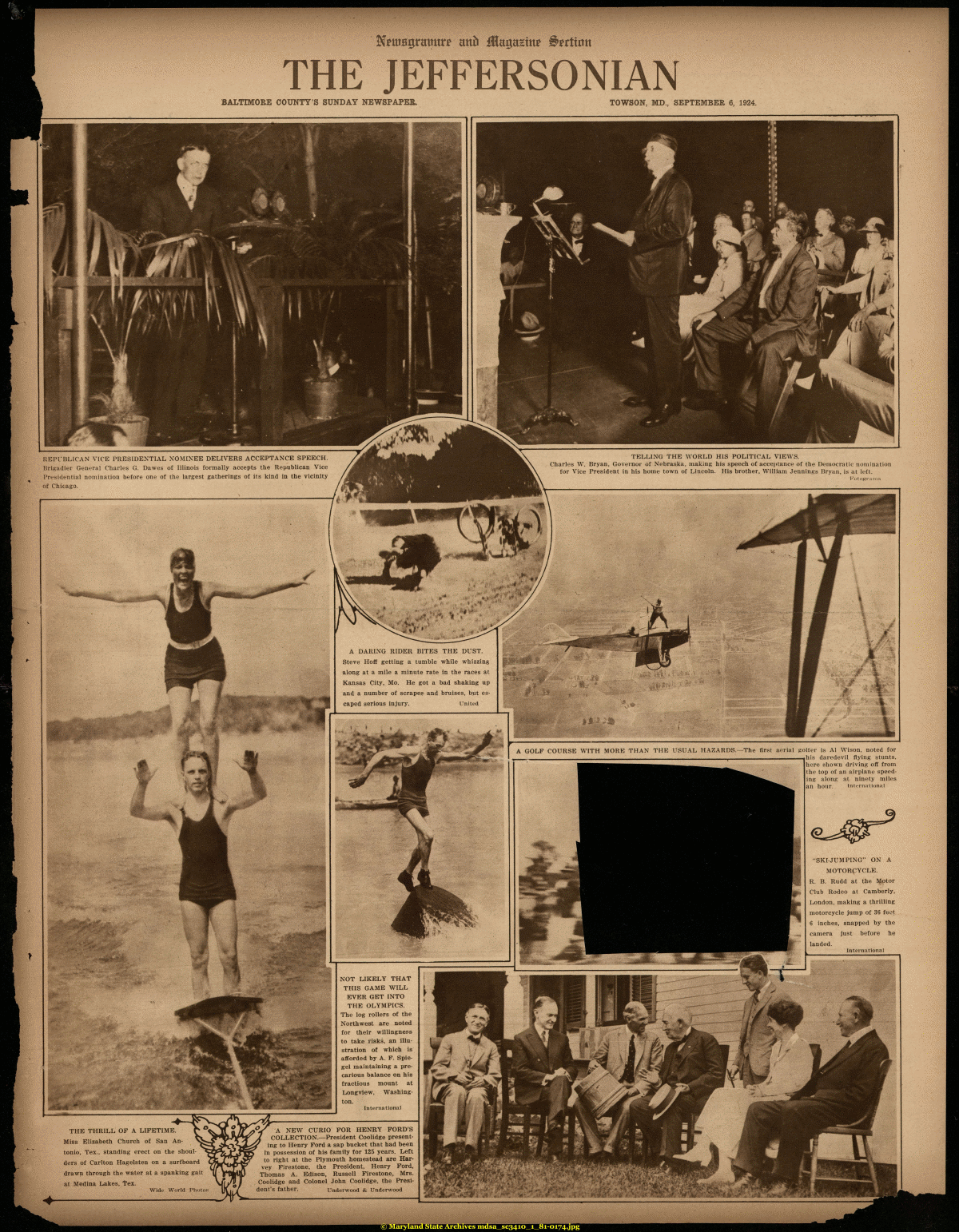 | THE JEFFERSONIAN BALTIMORE COUNTY'S SUNDAY NEWSPAPER. TOWSON, MD., SEPTEMBER 6, 1924. THE THRILL OF A LIFETIME. Miss Elizabeth Church of San An tonio, Tex., standing erect on the shoulders of Carlton Hagelsten on a surfboard drawn through the water at a spanking gait at Medina Lakes, Tex. Wide World Photos m aryland State Archives mdsa_sc3410_1_81-0174.jpg |