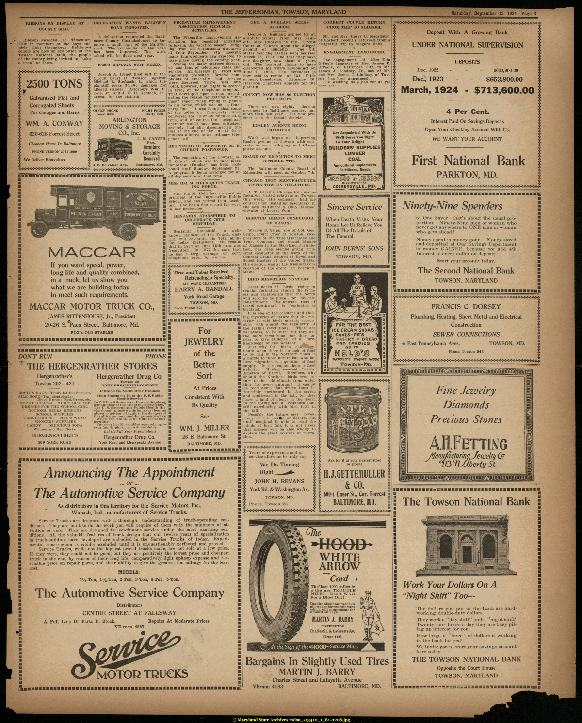 | THE JEFFERSONIAN, TOWSON, MARYLAND Saturday, September 13, 1924—Page 3 RIBBONS ON DISPLAY AT COUNTY SEAT. Ribbons awarded _at .Timonium Fair to members of the boys and girls' clubs throughout Baltimore] county are now on exhibition at the Towson National Bank, the people of the county being invited to "take a peep" at them. I ft i Y Y Y Y ? i Y 1 I x 2500 TONS Galvanized Flat and Corrugated Sheets For Garages and Barns WM. A. CONWAY 620-628 Forrest Street Cheapest House In Baltimore PHONE VERNON 2751-1999 We Deliver Everywhere DELEGATION WANTS BALDWIN ROAD IMPROVED. PIKESVILLE IMPROVEMENT ASSOCIATION RESUMES ACTIVITIES. A delegation requested the Baltimore County Commissioners to improve a small part of the Baldwin road. The 'remainder of the road has been improved. The work asked will be done next year. $5000 DAMAGE SUIT FILED. Joseph A. Hundt filed suit in the Circuit Court at Towson against Michael L. Stefanski in which the plaintiff seeks $5,000 damages for alleged slander. Attorneys Wm. P. Cole, Jr., and J. F. H. Gorsuch, Jr., appear for the plaintiff. x***^:**^***************** OFFICF PHONE NIGHT PHONE Forest 6905 Liberty 1531 ARLINGTON MOVING & STORAGE CO., Inc. L. M. CARVER Pres. Furniture Carefully Removed 4 E. Belviilere Ave. Baltimore, Md. 8WWWS bs ¦ tiWrn'mm iiBiliieit ¦ m a •a a m m m <3 S If you want speed, power, long life and quality combined, in a truck, let us show you what we are building today to meet such requirements. I MACCAR MOTOR TRUCK CO., JAMES RITTENHOUSE, Jr., President I 20*26 S. Taca Street, Baltimore, Md. | FOX'S OLD STABLES '^^¦¦¦^¦¦¦¦¦¦¦¦¦¦¦¦¦¦¦¦¦¦¦¦¦aHa DON'T RUN PHONE THE HERGENRATHER STORES Hergenrather Drug Co. Hergenrather's Towson 202 - 427 BOSTON BAGS—Handy for the Shopper. SILK HOSE—The latest shades. Blues, Browns, Red, Green, etc. INFANT DRESSES, MIDDY BLOUSES DRESSES FOR THE SCHOOL GIRL NOTIONS, BELLS, RIBBONS SCHOOL SUPPLIES TENNIS GOODS MEN'S WEAR SMOKERS' SUPPLIES CANDY DELICIOUS SODA Women and Men Clerks HERGENRATHER'S 509 YORK ROAD ¦BMIIBIIIBIBEBIBaBIl Towion 39 TOUY PRESCRIPTION STORE Little Chats Ahout Drug Business Plain Statement from the U. S. Public Health Service "AVOID self drug-gringr, Beware the plausible humbug-of the patent medicine faker." The U. S. Government Public Health Service doesn't mince words but uses them as above to advise all against the dangers of this all too common and dangerous practice When you are ill is no time for experimenting. Put your health troubles squarely up to your family physician without delay. Let Us Fill Your Prescriptions Hergenrather Drug Co. York Road and Chesypeake Avenue ¦ ¦¦¦¦¦¦¦¦¦¦¦¦¦¦¦¦¦BIB The Pikesville Improvement Association has resumed activities following the vacation season. Judg ing from the enthusiasm displayed at their September 8 th meeting many improvements are expected to take place during the coming year. Among the many matters discussed was that of telephone rates and service: An increase in rates was vigorously protested. Several complaints of especially bad service; were discussed. There was one) point, however, that might be scored in favor of the telephone company. That developed upon a man investigating the reason for getting a "line busy" report when trying to phone to his home, which was on a four-party line. It was found that some of the ladies on four-party lines conversed for 20 or 30 minutes at a time, and of course the telephone operator would have been criticized severely had she disconnected the line at the end of the usual three minutes allotted to an ordinary telephone call. ----------o---------- REOPENING OF EPWORTH M. E. CHURCH POSTPONED. The reopening of the Epworth M. E. Church which was to take place tomorrow (Sunday) has been postponed until Sunday, September 28. A program is being arranged for an all-day service at that time. ----------o---------- MISS IDA M. HELD QUITS TEACHING FORCE. Miss Ida M. Held has resigned as principal of the Baynesville Public School, and has retired from teaching. She has a fine record for work in her profession. ----------o---------- BENJAMIN STANSFIELD TO CELEBRATE 79TH BIRTHDAY. Benjamin Stansfield, a well-known resident of the Fourth district, will celebrate his 79th birthday today (Saturday). He recalls that in 1877 on June 15th corn was frostbitten. In 1873 he says that he had a large acreage of corn completely eaten by worms. $ Tires and Tubes Repaired. ?*; Retreading a Specialty. ?*? ALL WORK GUARANTEED | HARRY A. RANDALL \ York Road Garage % TOWSON, MD. V ?,? Phone, Towson 525 •SilBSIBilBSBfllBBl! ¦ For ¦ JEWELRY of the ¦ Better Sort ¦ At Prices Consistent With Its Quality ¦ See ¦ ¦ WM. J. MILLER 28 E. Baltimore St. BALTIMORE, MD. ¦ ^¦¦¦¦¦¦¦¦¦¦¦¦¦¦¦B EEHEHHSE !¦¦¦¦¦'¦¦¦¦¦¦¦¦¦¦¦¦¦¦¦¦¦¦¦¦¦¦ El ¦ «s m u ffl n Announcing The Appointment ...OF... The Automotive Service Company As distributors in this territory for the Service Motors, Inc., Wabash, Ind., manufacturers of Service Trucks. Service Trucks are designed with a thorough understanding of truck-operating conditions. They are built to do the work you will require of them with the minimum of attention or care. They are designed for continuous service under the most exacting conditions. All the valuable features of truck design th#t our twelve years of specialization in truck-building have developed are embodied in the Service Trucks of today. Experimental construction is rigidly excluded until it is unquestionably perfected and proved. Service Trucks, while not the highest priced trucks made, are not sold at a low price. If they were, they could not be good, but they are positively the lowest price and cheapest truck in the end, by reason of their long life, comparatively light upkeep expense and reasonable price on repair parts, and their ability to give the greatest ton mileage for the least cost. MODELS: l^-Ton, 1%-Ton, 2-Ton, 3-Ton, 4-Ton, 5-Ton. The A