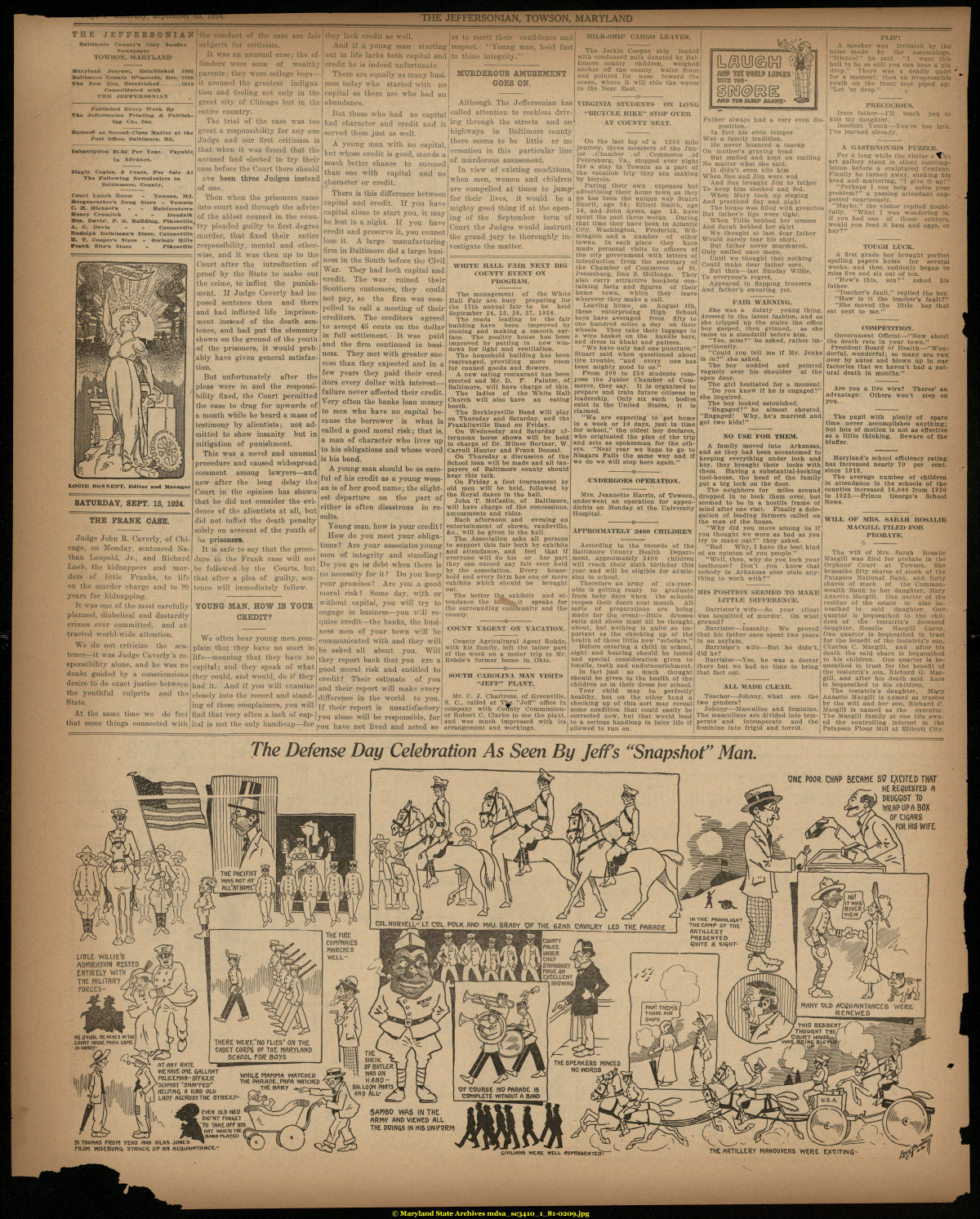 | THE JEFFERSONIAN, TOWSON, MARYLAND THE JEFFERSONIAN Baltimore Conuty's Only Sunday Newspaper TOWSON, MLARYLAND Maryland Journal, Established 1885 Baltimore County Democrat, Eat. 1885 Tae New Era, Established.......1013 Consolidated with THE JEFFERS8NUN Published Every Week By ¦The Jefiersonian Printing: & Publishing Co., Inc. Watered as Second-Class Matter at the Post Office, Baltimore, Md. lahacrlption $1.50 Per Year. Payable In Advance. glaffle Copies, 5 Cents, For Sale At The Following; Newsdealers In Baltlomore, County. Court Iiunch Room - Towson, Md. Hergrenrather's Drug: Store - Towson C. H. Michael's - - Relsterstown Henry Crumlich - - Dundalk Mrs, Davis', P. O. Building-, Pikesvllle A, C. Davis - - Catonsville Rudolph Deihlman's Store, Catonsville ffi. T. Cooper's Store - Owings Mills Frank Zlto's Store - Pikesvllle LOGIE BONiVETT, Editor and Manager SATURDAY, SEPT. 13, 1924. THE FRANK CASE. Judge John R. Caverly, of Chicago, on Monday, sentenced Nathan Leopold, Jr., and Richard Loeb, the kidnappers and murders • of little Franks, to life on the murder charge and to 99 years for kidnapping. It was one of the most carefully planned, diabolical and dastardly crimes ever committed, and attracted world-wide attention. We do not criticize the sentence—it was Judge Caverly's responsibility alone, and he was no doubt guided by a consciencious desire to do exact justice between the youthful culprits and the State. At the same time we do feel that some things connected with the conduct of the case are fair subjects for criticism. It was an unusual case; the offenders" were sons of wealthy parents; they were college boys— it aroused the greatest indignation and feeling not only in the great city of Chicago but in the entire country. The trial of the case was too great a responsibility for any one Judge and our first criticism is that when it was found that the accused had elected to try their case before the Court there should ave been three Judges instead of one. Then when the prisoners came into court and through the advice of the ablest counsel in the country pleaded guilty to first degree murder, that fixed their entire responsibility, mental and otherwise, and it was then up to the Court after the introduction of proof by the State to make out the crime, to inflict the punishment. If Judge Caverly had imposed sentence then and there and had inflicted life imprisonment instead of the death sentence, and had put the clemency shown on the ground of the youtli of the prisoners, it would probably have given general satisfaction. But unfortunately after the pleas were in and the responsibility fixed, the Court permitted the case to drag for upwards of a month while he heard a mass of testimony by alientists; not admitted to show insanity but in mitigation of punishment. This was a novel and unusual procedure and caused widespread comment among lawyers—and now after the long delay the Court in the opinion has shown that he did not consider the evidence of the alientists at all, but did not inflict the death penalty solely on account of the youth of he prisoners. It is safe to say that the procedure in the Frank case will not be followed by the Courts, but that after a plea of guilty, sentence will immediately follow. YOUNG MAN, HOW IS YOUR CREDIT? We often hear young men .complain that they have no start in life—meaning that they have no capital; and they speak of what they could, and would, do if they had it. And if you will examine closely into the record and stand- they lack credit as well. And if a young man starting out in life lacks both capital and credit he is indeed unfortunate. There are equally as many busi-men today who started Math no capital as there are who had an abundance. But those who had no capital had character and credit and it served them just as well. A young man with no capital, but whose credit is good, stands a much better chance to succeed than one with capital and no character or credit. There is this difference between capital and credit. If you have capital alone to start you, it may be lost in a night. If you have credit and preserve it, you cannot lose it. A large manufacturing firm in Baltimore did a large business in the South before the Civil War. They had both capital and credit. The war ruined their Southern customers, they could not pay, so the firm was compelled to call a meeting of their creditors. The creditors agreed to accept 45 cents on the dollar in full settlement. • It was paid and the firm continued in business. They met with greater success than they expected and in a few years they paid their creditors every dollar with interest—• failure never affected their credit. Very often the banks loan money to men who have no capital because the borrower is what is called a good moral risk; that is, a man of character who lives up to his obligations and whose word is his bond. A young man should be as careful of his credit as a young woman is of her good name; the slightest departure on the part of either is often disastrous in results. Young man, how is your credit ? How do you meet your obligations ? Are your associates young men of integrity and standing1? Do you go in' debt when there is no necessity for it? Do you keep your promises? Are you a good moral risk? Some day, with or without capital, you will try to engage in business—you will require credit—the banks, the business men of your town will be communicated with and they will be asked all about you. Will they report back that you are a good moral risk and entitled to credit? Their estimate of you and their report will make every difference in the world to you. If their report is unsatisfactory as to merit their confidence and respect. "Young man, hold fast to thine integrity." MURDEROUS AMUSEMENT GOES ON. Although The Jeffersonian has j called attention to reckless driving through the streets and on J highways in Baltimore county or no there seems to be little cessat
