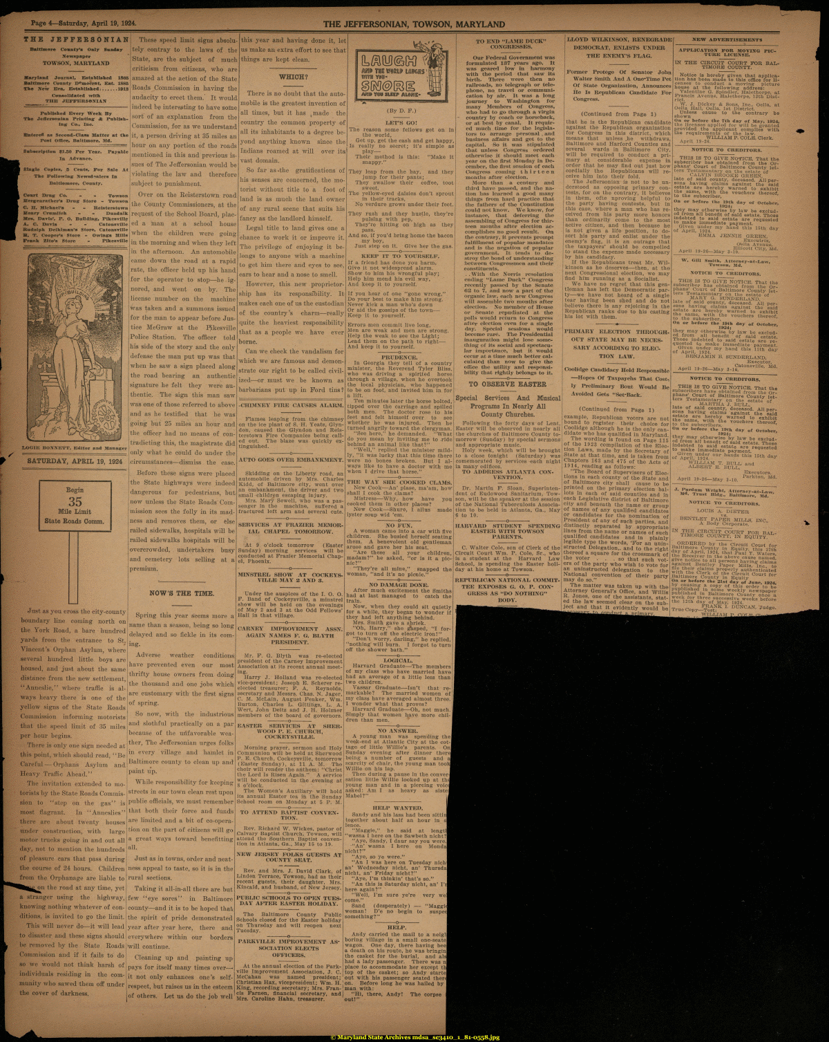 | Page 4—Saturday, April 19, 1924. THE JEFFERSONIAN, TOWSON, MARYLAND / THE JEFFERSONIAN Baltimore County's Only Sunday Newspaper TOWSON, MARYXAND Maryland Journal, Established 1865 Baltimore County Democrat, Est. 1885 The New Era, Established....... 1018 Consolidated with THE JEFFERSONIAN Published Every Week By The Jeffersonian Printing: & Publishing Co., Inc. JButered as Second-Class Matter at the Post Office, Baltimore, Md. Subscription $1.50 Per Year. Payable In Advance. Single Copies, 5 Cents, For Sale At The Following; Newsdealers In Baltiomore, County. Court Drug: Co. - - Towson Mergenrather's Drug Store - Towson C. H. Michael's - - Relsterstown Henry Crnmlich - - Dundalk Mrs. Davis', P. O. Building, Pikesvllle A. C. Davis - - Catonsvllle Rudolph Deihlman'a Store, Catonsvllle M. T. Cooper's Store - Owlngs Mills Frank: Zito's Store - Pikesvllle liOGIE BONNETT, Editor and Manager SATURDAY, APRIL 19, 1924 Begin 35 Mile Limit State Roads Comm. Just as you cross the city-county boundary line coming north on the York Road, a bare hundred yards from the entrance to St. Vincent's Orphan Asylum, where several hundred little boys are housed, and just about the same distance from the new settlement, "Anneslie," where traffic is always heavy there is one of the yellow signs of the State Roads Commission informing motorists that the speed limit of 35 miles per hour begins. There is only one sign needed at this point, which should read, ''Be Careful — Orphans Asylum and Heavy Traffic Ahead." The invitation extended to motorists by the State Roads Commission to "step on the gas" is most flagrant. In "Anneslies" there are about twenty houses under construction, with large motor trucks going in and out all day, not to mention the hundreds of pleasure cars that pass during the course of 24 hours. Children from the Orphanage are liable to on the road at any time, yet a stranger using the highway, knowing nothing whatever of conditions, is invited to go the limit. This will never do—it will lead to disaster and these signs should be removed by the State Roads Commission and if it fails to do so we would not think harsh of individuals residing in the community who sawed them off under the cover of darkness. These speed limit signs absolutely contray to the laws of the State, are the subject of much criticism from citizens, who are amazed at the action of the State Roads Commission in having the audacity to erect them. It would indeed be interesting to have some sort of an explanation from the Commission, for as we understand it, a person driving at 35 miles an hour on any portion of the roads mentioned in this and previous issues of The Jeffersonian would be violating the law and therefore subject to punishment. Over on the Reisterstown road the County Commissioners, at the request of the School Board, placed a man at a school house when the children were going in the morning and when they left in the afternoon. An automobile came down the road at a rapid rate, the officer held up his hand for the operator to stop—he ignored, and went on by. The license number on the machine was taken and a summons issued for the man to appear before Justice McGraw at the Kkesville Police Station. The officer told his side of the story and the only defense the man put up was that when he saw a sign placed along the road bearing an authentic signature he felt they were authentic. The sign this man saw was one of those referred to above and as he testified that he was going but 25 miles an hour and the officer had no means of contradicting this, the magistrate did only what he could do under the circumstances—dismiss the case. Before these signs were placed the State highways were indeed dangerous for pedestrians, but now unless the State Roads Commission sees the folly in its madness and removes them, or else railed sidewalks, hospitals will be railed sidewalks hospitals will be overcrowded, undertakers busy and cemetery lots selling at a premium. NOW'S THE TIME. Spring this year seems more a name than a season, being so long delayed and so fickle in its coming. Adverse weather conditions! have prevented even our most thrifty house owners from doing the thousand and one jobs which are customary with the first signs of spring. So now, with the industrious and slothful practically on a par because of the unfavorable weather, The Jeffersonian urges folks in every village and hamlet in Baltimore county to clean up and paint up. While responsibility for keeping streets in our town clean rest upon public officials, we must remember that both their force and funds are limited and a bit of co-operation on the part of citizens will go a great ways toward benefitting all. Just as in towns, order and neatness appeal to taste, so it is in the rural sections. Taking it all-in-all there are but few "eye sores" in Baltimore county—and it is to be hoped that the spirit of pride demonstrated year after year here, there and everywhere within our borders will continue. Cleaning up and painting up pays for itself many times over-it not only enhances one's self-respect, but raises us in the esteem of others. Let us do the job well this year and having done it, let us make an extra effort to see that things are kept clean. WHICH? There is no doubt that the automobile is the greatest invention of all times, but it has (made the country the common property of all its inhabitants to a degree beyond anything known since the Indians roamed at will over its; vast domain. So far as«the gratifications of his senses are concerned, the motorist without title to a foot of land is as much the land owner of any rural scene that suits his fancy as the landlord himself. Legal title to land gives one a chance to work it or improve it. The privilege of enjoying it belongs to anyone with a machine to get him there and eyes to see, ears to hear and a nose to smell. However, this new proprietorship has its responsibility. It makes each one of us 