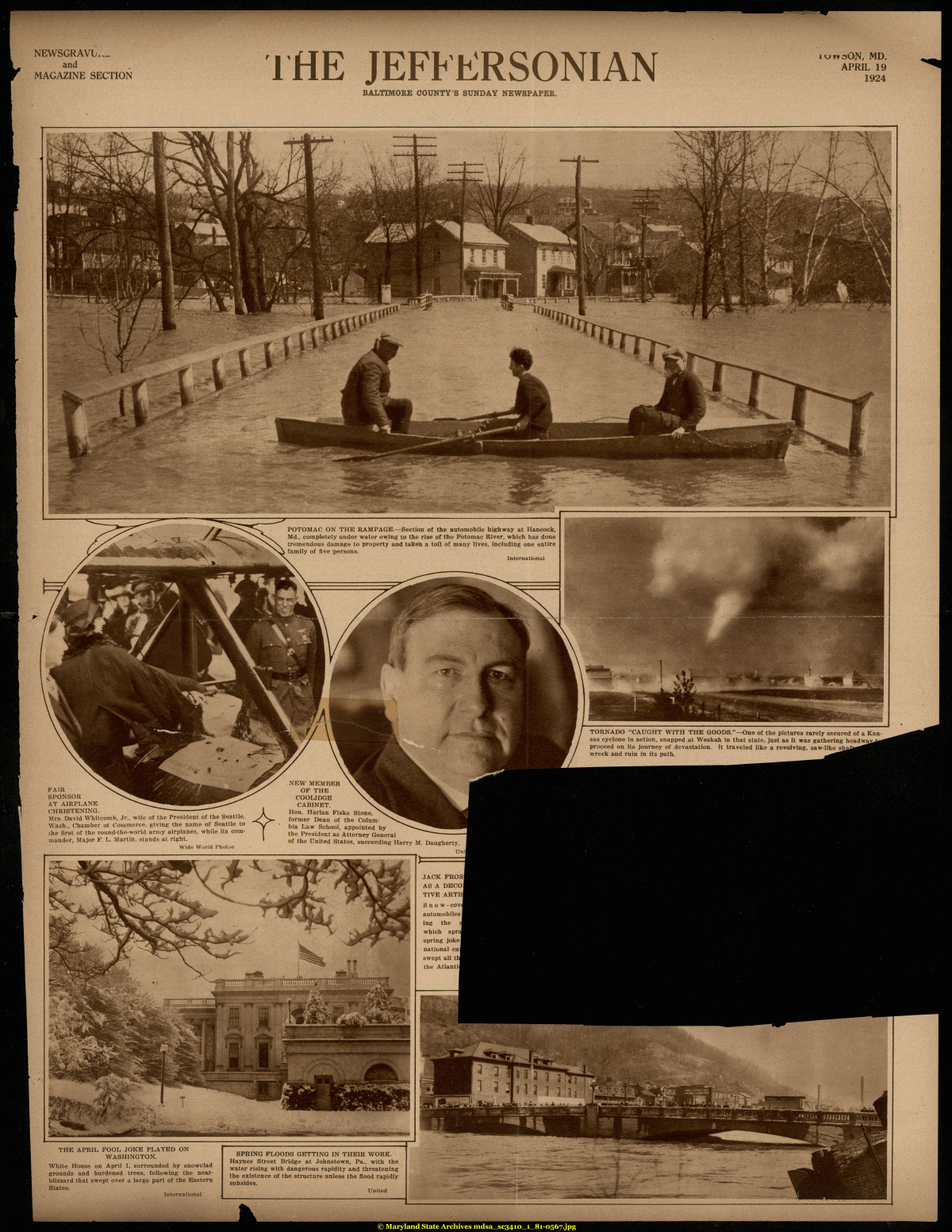 | NEWSGRAVL.^. and MAGAZINE SECTION 1 HE JEFPERSONIAN iUTtsON, MD. APRIL 19 1924 BALTIMORE COUNTY'S SUNDAY NEWSPAPER. POTOMAC ON THE RAMPAGE.—Section of the automobile highway at Hancock, Md., completely under water owing to the rise of the Potomac River, which has done tremendous damage to property and taken a toll of many lives, including one entire family of five persons. International TORNADO "CAUGHT WITH THE GOODS."—One of the pictures rarely secured of a Kansas cyclone in action, snapped at Weskah in that state, just as it was gathering headwa^ proceed on its journey of devastation. It traveled like a revolving, saw-like si wreck and ruin in its path. FAIR SPONSOR AT AIRPLANE CHRISTENING. Mrs. David Whitcomb, Jr., wife of the President of the Seattle, Wash., Chamber of Commerce, giving the name of Seattle to the first of the round-the-world army airplanes, while its commander, Major- F. L. Martin, stands at right. Wide World Photos NEW MEMBER OF THE COOLIDGE CABINET. Hon. Harlan Fiske Stone, former Dean of the Columbia Law School, appointed by the President as Attorney General of the United States, succeeding Harry M. Daugherty. Unil JACK FROSI AS A DECof TIVE ARTU Snow- covd automobiles | ing the which spra spring jokel national cai swept all tl the Atlantic THE APRIL FOOL JOKE PLAYED ON WASHINGTON. White House on April 1, surrounded by snowclad grounds and burdened trees, following the near-blizzard that swept over a large part of the Eastern States. International SPRING FLOODS GETTING IN THEIR WORK. Haynes Street Bridge at Johnstown, Pa., with the water rising with dangerous rapidity and threatening the existence of the structure unless the flood rapidly subsides. United |