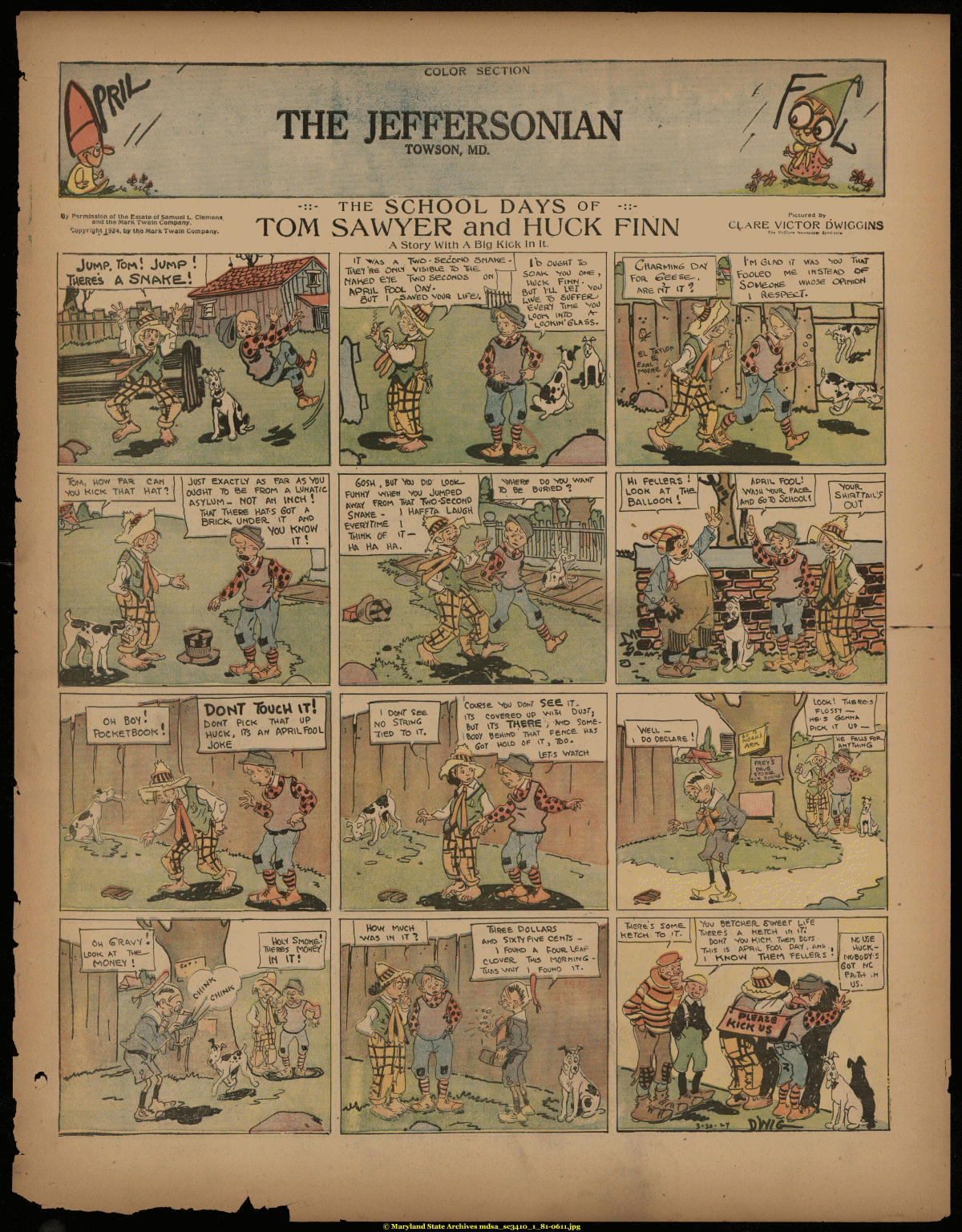 | >R SECTION T 6y Permission of the Estate of Samuel L. Clemens and the Mark Twain Company. ^Qpyrigh*J924. by tt\Q Mark Twain Company. •::- THE SCHOOL DAYS OF TOM SAWYER and HUCK FINN Pictured by C^ARE VICTOR DWIGGINS The MtC'urj N«-ip»pv iynicum. A Story With A Big Kick In It. iT >*/as a . Tvo - secor*o ariAKe-l i>D O06VVr -^ 50T 1 ^SAVeo voOft u^e;. .if jt^^jpmi .-*-' L cu Bo^ toe KeT Book * ITT! DohT T&ocv* \t! DonT Pick t*at up HUCK, ITS Art &PRU-TO0L J0K6 I DonT See fs^O STwviG Ties To it. Course Voo donT S€L€» \T- \T5 C0V6R6O OP ^T* °U3TJ *0T VT5 TIJWV'^^-li^ODY ^eA\HD 7VAKT P6*ce U*5 *-\ OF vT, TbO. FLOSSY — *S Veu. _ \ do Deduce _ 1 Taw iinnirri~firiiw 1 1 1 H£Tch To 'T. ---------------7 — Tae^es a Keren vn iT.' Doh7 Voo KvCr< Tv\e^ Bcvs ¦ TvWS IS A^V. tt*>\. DA^.Ar^., NCU5E Got nc f fc.Tv* ;H OS. |
