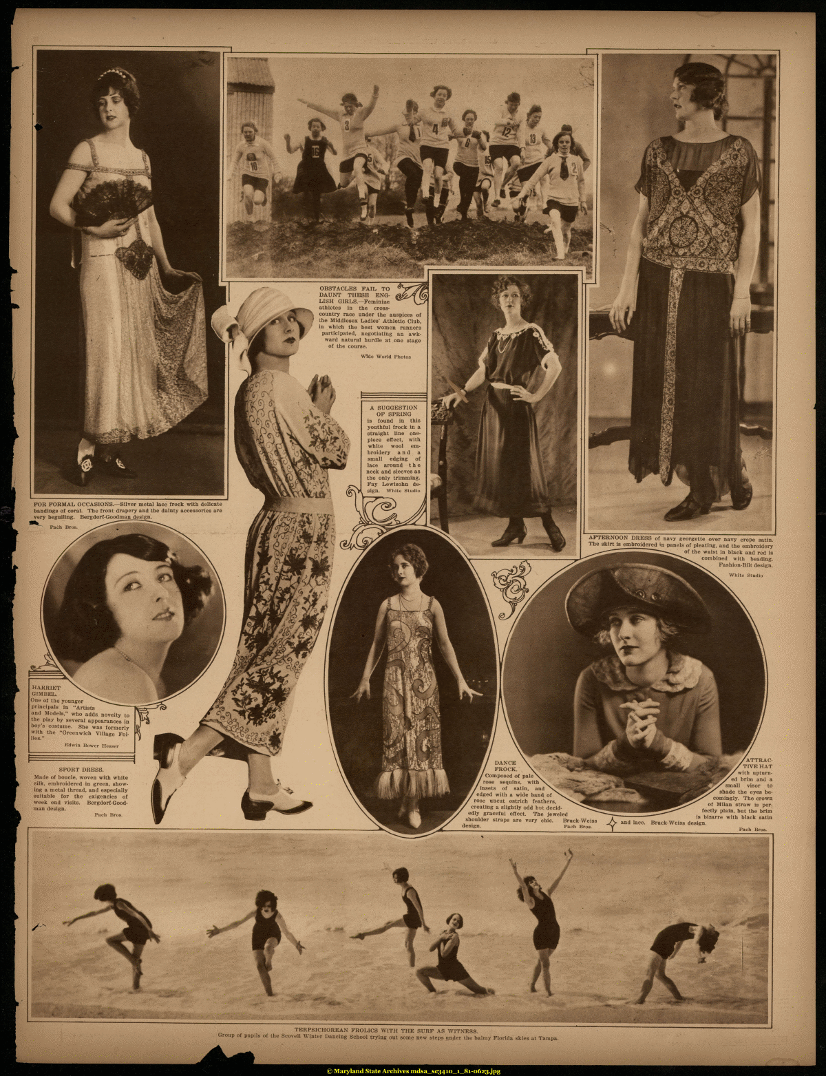 | HARRIET GIMBEL. One of the younger principals in "Artists and Models," who adds, novelty to the play by several appearances in boy's costume. She was formerly with the "Greenwich Village Follies." Edwin Bovver Hesser SPORT DRESS. Made of boucle, woven with white silk, embroidered in green, showing a metal thread, and especially suitable for the exigencies of week end visits. Bergdorf-Good-man design. Pach Bros. and lace. 'ATTRACTIVE HAT with upturned brim and a small visor to shade the eyes becomingly. The crown of Milan straw is perfectly plain, but the brim is bizarre with black satin Bruck-Weiss design. Pach Bros. /¦ TERPSICHOREAN FROLICS WITH THE SURF AS WITNESS. Group of pupils of the Scovell Winter Dancing School trying out some new steps under the balmy Florida skies at Tampa. |
