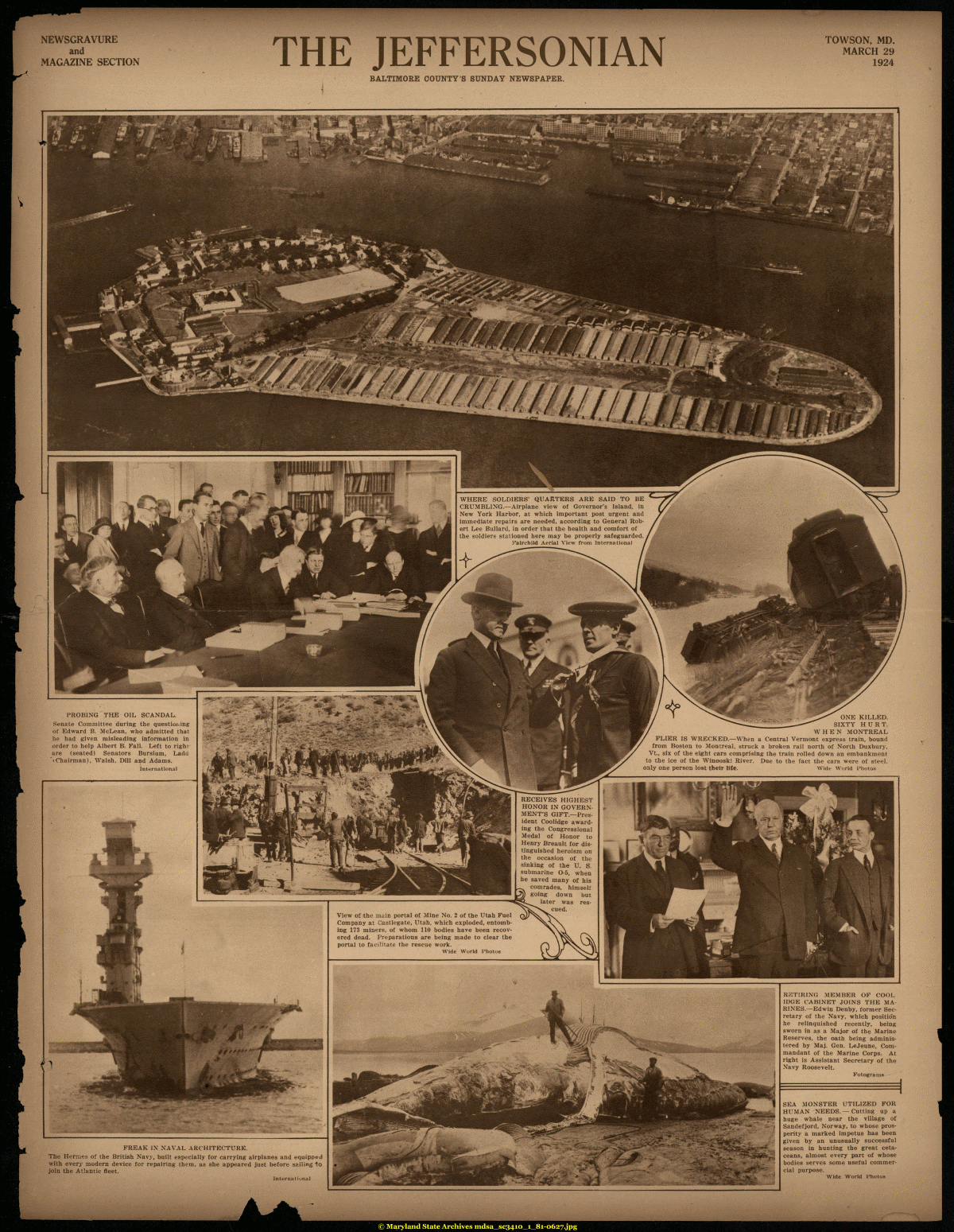 | NEWSGRAVURE and MAGAZINE SECTION THE JEFFERSONIAN TOWSON, MD. MARCH 29 1924 BALTIMORE COUNTY'S SUNDAY NEWSPAPER. FREAK IN NAVAL ARCHITECTURE. The Hermes of the British Navy, built especially for carrying airplanes and equipped with every modern device for repairing them, as she appeared just before sailing to join the Atlantic fleet. International RETIRING MEMBER OF COOL IDGE CABINET JOINS THE MARINES.—Edwin Denby, former Secretary of the Navy, which position he relinquished recently, being sworn in as a Major of the Marine Reserves, the oath being administered by Maj. Gen. LeJeune, Commandant of the Marine Corps. At right is Assistant Secretary of the Navy Roosevelt. Fotograms SEA MONSTER UTILIZED FOR HUMAN NEEDS. —Cutting up a huge whale near the village of Sandefjord, Norway, to whose prosperity a marked impetus has been given by an unusually successful season in hunting the great cetaceans, almost every part of whose bodies serves some useful commercial purpose. Wide World Photos |
