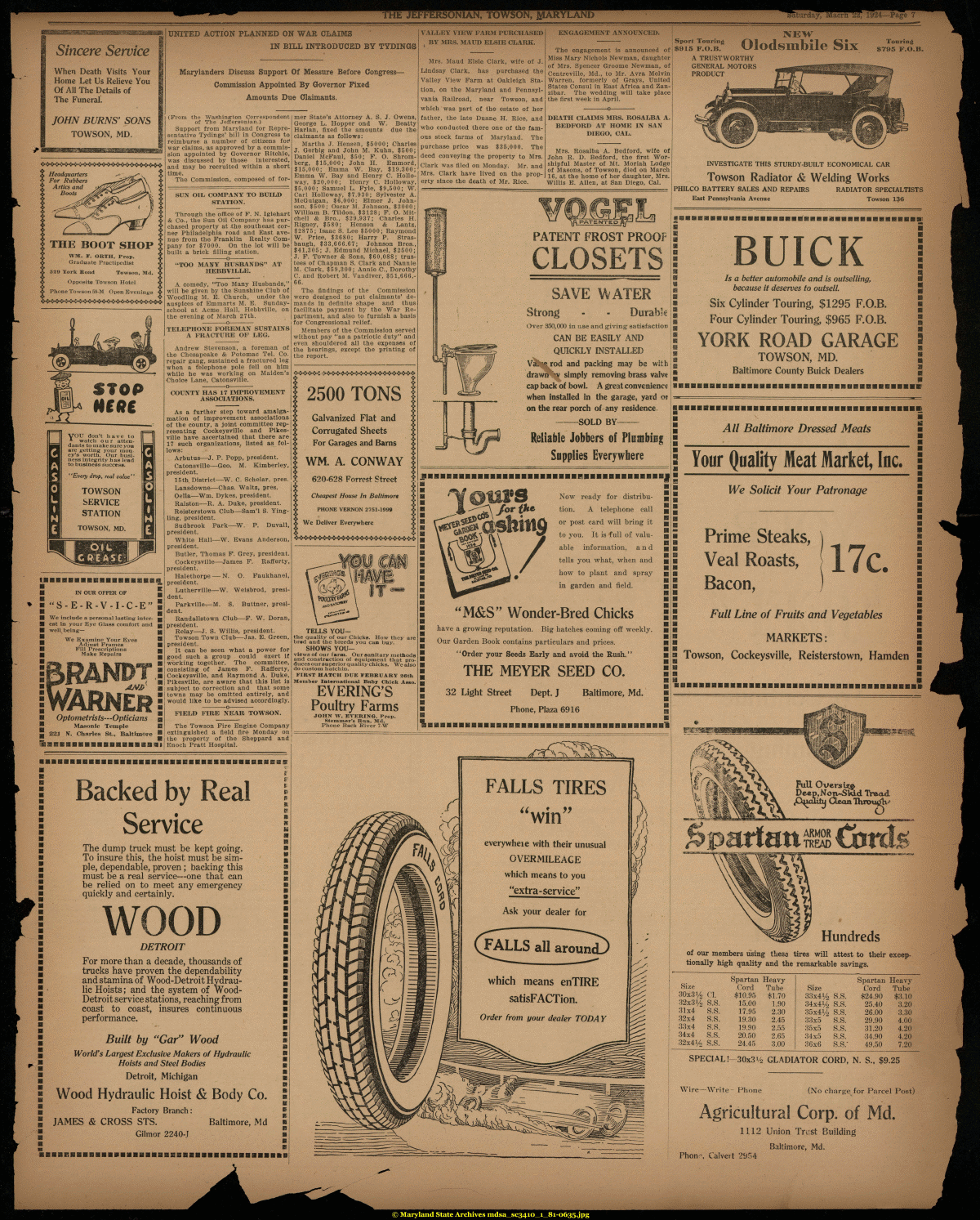 | THE JEFFERSONIAN, TOWSON, MARYLAND ^tumayTMacri^i!!; 1224—Page 7 Sincere Service When Death Visits Your Home Let Us Relieve You Of All The Details of The Funeral. JOHN BURNS' SONS TOWSON, MD. Headquarters For Rubbers Arties and Boots $m*4^***********«*«**««*** I THE BOOT SHOP WM. F. ORTH, Prop. Graduate Practipedist 589 York Boad Towson, Md. Opposite Towson Hotel Phone Towson 59-M Open Evenings UNITED ACTION PLANNED ON WAR CLAIMS IN BILL INTRODUCED BY TYDINGS Marylanders Discuss Support Of Measure Before Congress-Commission Appointed By Governor Fixed Amounts Due Claimants. (From the Washington Correspondent of The Jeffersonian.) Support from Maryland for Representative Tydings' bill in Congress to reimburse a number of citizens for1 war claims, as approved by a commission appointed by Governor Ritchie, was discussed by those interested, and may be recruited within a short time. The Commission, composed of for- SUN OIL COMPANY TO BUIU> STATION. Through the office of F. N. Iglehart & Co., the Sun Oil Company has purchased property at the southeast corner Philadelphia road and East avenue from the Franklin Realty Company for $7000. On the lot will be built a brick filling station. ----------o---------- "TOO MANY HUSBANDS" AT HEBBVILLE. A comedy, "Too Many Husbands," will be given by the Sunshine Club of Woodling M. E. Church, under the auspices of Emmarts M. E. Sunday-school at Acme Hall, Hebbville, on the evening of March 27th. ----------o---------- TELEPHONE FOREMAN SUSTAINS A FRACTURE OF LEG. STOP MfffC VOU don't have to * watch our attendants to make sure you are getting: your money's worth. Our business integrity has lead to business success. ' 'Every) drop, real value'' TOWSON SERVICE STATION TOWSON, MD. OIL cfttAse Andrew Stevenson, a foreman of the Chesapeake & Potomac Tel. Co. repair gang, sustained a fractured leg when a telephone pole fell on him while he was working on Maiden's Choice Lane, Catonsville. ----------o---------- COUNTY HAS 17 IMPROVEMENT ASSOCIATIONS. mer State's Attorney A. S. J. Owens, George L. Hopper ond W. Beatty Harlan, fixed the amounts due the claimants as follows: Martha J. Hensen, $5000; Charles J. Gerbig and John M. Kuhn, $500; Daniel McFaul, $50; F. O. Shrom-berg, $15,000; John H. Emmord, $15,000; Emma W. Bay, $19,300; Emma W. Bay and Henry C. Hollo-way, $20,000; Henry C. Holloway, $5,000; Samuel L. Fyle, $9,500; W. Carl Holloway, $7,930; Sylvester A. McGuigan, $6,000; Elmer J. Johnson, $500; Oscar M. Johnson, $3000; William B. Tildon, $3128; F. O. Mitchell & Bro., $29,937; Charles H. Rigney, $580; Henson & Lantz, $2875; Isaac S. Lee $5000; Raymond W. Price, $3680; Harry P. Stras-baugh, $33,666.67; Johnson Bros., $41,305; J. Edmund Michael, $2500; J. F. Towner & Sons, $60,088; trustees of Chapman S. Clark and Nannie M. Clark, $59,300; Annie C., Dorothy C. and Robert M. Vandiver, $51,666,-66. The findings of the Commission were designed to put claimants' demands in definite shape and thus facilitate payment by the War Repayment, and also to furnish a basis for Congressional relief. Members of the Commission served without pay "as a patriotic duty" and even shouldered all the expenses of the hearings, except the printing of the report. IflHBI IN OUR OFFER OF "S-E-R-V-I-C-E" We include a personal lasting interest in your Eye Glass comfort and well-being— We Examine Your Eyes Adjust Frames Fill Prescriptions Make Repairs m WRNER Optometrists—Opticians Masonic Temple 221 N. Charles St., Baltimore As a further step toward amalgamation of improvement associations of the county, a joint committee representing Cockeysville and Pikes-ville have ascertained that there are 17 such organizations, listed as follows: Arbutus—J. P. Popp, president. Catonsville—Geo. M. Kimberley, j president. 15th District—W. C Schelar, pres. Lansdowne—Chas, Waltz, pres. Oella—Wm. Dykes, president. Ralston—R. A. Duke, president. Reisterstown Club—Sam'l S. Ying-ling, president. Sudbrook Park—W. P. Duvall, president. White Hall—W. Evans Anderson, president. Butler, Thomas F. Grey, president. Cockeysville—James F. Rafferty, president. Halethorpe — N. O. Faukhanel, president. Lutherville—W. Weisbrod, president. Parkville—M. S. Buttner, president. Randallstown Club—F. W. Doran, president. Relay—J. S. Willis, president. Towson Town Club—Jas. E. Green, president. It can be seen what a power for good such a group could exert if working together. The committee, consisting of James F. Rafferty, Cockeysville, and Raymond A. Duke, Pikesville, are aware that this list is subject to correction and that some towns may be omitted entirely, and would like to be advised accordingly. ----------o---------- FIELD FIRE NEAR TOWSON. The Towson Fire Engine Company extinguished a field fire Monday on ¦ j the property of the Sheppard and 2500 TONS Galvanized Flat and Corrugated Sheets For Garages and Barns WM. A. CONWAY 620-628 Forrest Street Cheapest House In Baltimore PHONE VERNON 2751-1999 We Deliver Everywhere VALLEY VIEW FARM PURCHASED BY MRS. MAUD ELSIE CLARK. Mrs. Maud Elsie Clark, wife of J. Lindsay Clark, has purchased the Valley View Farm at Oakleigh Station, on the Maryland and Pennsylvania Railroad, near Towson, and which was part of the estate of her father, the late Duane H. Rice, and who conducted there one of the famous stock farms of Maryland. The purchase price was $35,000. The deed conveying the property to Mrs. Clark was filed on Monday. Mr. and Mrs. Clark have lived on the property since the death of Mr. Rice. ENGAGEMENT ANNOUNCED. The engagement is announced of Miss Mary Nichols Newman, daughter of Mrs. Spencer Groome Newman, of Centreville, Md., to Mr. Avra Melvin Warren, formerly of Grays, United States Consul in East Africa and Zanzibar. The wedding will take place the first week in April. DEATH CLAIMS MRS. ROSALBA A. BEDFORD AT HOME IN SAN DIEGO, CAL. Mrs. Rosalba A. Bedford, wife of John R. D. Bedford, the first Worshipful Master of Mt. Mori