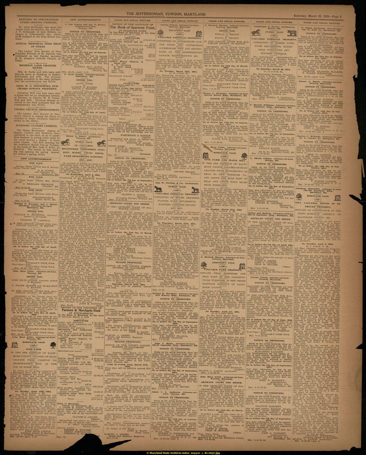 | THE JEFFERSONIAN, TOWSON, MARYLAND Saturday, March 22, 1924—Page 5 RETURNS TO INDIANAPOLIS AFTER VISITING PARENTS. Mr. Allen Kelbaugh, who spent the winter with his parents, Mr. and Mrs. J. F. Kelbaugh, of near Millers, returned to Indianapolis, Ind., where he % engaged in the Real Estate business. ----------o---------- ANNUAL MEMORIAL MASS HELD AT TEXAS. The Ladies' Mite Society of Pine ^.Friendly Friends of St. Patrick was 'celebrated on last Sunday morning at St. Joseph's Catholic Church, at Texas. ----------o---------- MONKTON LAND CHANGES HANDS. Wm. B. Parks and wife have sold fifty-six acres at Monkton to Robert McCracken and wife. The revenue stamps attached to the deed indicate that the consideration was $4500. ----------o---------- CHAS. W. E. TBEADWBLL PURCHASES TOWSON PROPERTY. Christian Will and wife have sold a house and lot on Alleghany avenue, at Towson, to Charles W. E. Tread-well and wife. Revenue stamps attached to the deed indicates that the consideration was $7000. ----------o---------- URGING CHURCH IMPROVEMENT. The Ladies' Mite Society af Pine Grove Church is urging the board of trustees to begin extensive improvements to the edifice. ----------o---------- ECONOMIC CLASSES COMBINE. The Home Economics classes of Sparks, Corbett and Monkton have combined in one unit, so as to assist Miss Graham in giving other units in the rural section a chance to form other classes. The first meeting for the combined classes was on Tuesday at the home of Mrs. John T. Price, at Monkton. The lesson at this meeting was making the spring bonnet for milady's spring attire. NEW ADVERTISEMENTS C. Gus Grason and Jas. P, Kelley, Attorneys-afLaw, Towson, Md. NOTICE TO CREDITORS. THIS IS TO GIVE NOTICE, That the subscribers have obtained from the Orphans' Court of Baltimore County letters of Administration on the estate of SAMUEL, STIFFLER, late of said county, deceased. All persons having claims against the said estate are hereby warned to exhibit the same, with the vouchers thereof, to the subscriber, On or before the 21st day of September, 1934: they may otherwise by law be excluded from all benefit of said estate. Those indebted to said estate are requested to make immediate payment. Given under my hand this 19th day of March, 1924. MARTHA MAY LLOYD, Administratrix, Phoenix, Md. Mar. 22-29—April 5-12.__________________ N. Irvin Gresitt, Attorney-at-Law, Baltimore, Md. ORDER NISI. ALICE JONES vs. ALBERT E. KILMER, LILLIE A. KILMER. IN THE CIRCUIT COURT FOR BALTIMORE COUNTY, IN EQUITY. ORDERED, by the Circuit Court for Baltimore County, this 21st day of March, 1924, that the sale made and reported by N. Irvin Gresitt, attorney named in Mortgage, for the sale of the property described in the proceedings in the above entitled cause be ratified and confirmed, unless cause to the contrary thereof be shown, On or before the 14th day of April, 1924: Provided a copy of this order be inserted in some newspaper printed and published in Baltimore County, once in each of three successive weeks before the said 14th day of April, 1924. The report states the amount of sales to be $600.00. WILLIAM P. COLE, Clerk. True Copy—Test: Mar. 22-29—Apr. 5-12. WILLIAM P. COLE, Clerk. Milton J. Dance, Auctioneer, Towson, Md. PUBLIC SALE OP VALUABLE NEW ADVERTISEMENTS FOR SALE. Antique Hand Carved Bed & Bureau. Phone Vernon 5232. E. M. OUSTIS, 1801 Guilford Ave., Mar. 22._________________Baltimore. Md. FOR SALE. 50 Tons Prime Alfalfa Hay, $30.00 per ton. G. BERNARD FENWICK, Glyndon, Md. Mch. 15-22-29__________________ _J___^ FOR SALE. Kemp Gas Light Machine with Stove. Price $35.00. STROHMINGER'S. Middle River, Md. Mar. 8-15-22. William F. Broening and C. Morris Harrison, Attorneys-at-Law, Baltimore, Md. ORDER NISI. WILLIAM F. BROENING, Attorney named in Mortgage vs. PINKNEY W. CARROLL. IN THE CIRCUIT COURT FOR BALTIMORE COUNTY, IN EQUITY. ORDERED, by the Circuit Court for Baltimore County, this 21st day of March, 1924, that the sale made and reported by William F. Broening, attor-ne named in Mortgage, for the sale of the property described in the proceedings in the above entitled cause be ratified and confirmed, unless cause to the contrary thereof be shown, On or before the 14th day of April, 1924: Provided a copy of this Order be inserted in some newspaper printed and published in Baltimore County, once in each of three successive weeks before the said 14th day of April, 1924. The report states the amount of sales to be $500.00. WILLIAM P. COLE, Clerk. True Copy—Test: WILLIAM P. COLE, Clerk. Mar. 22-29—Apr. 5-12. John Mays Little, Attorney-at-Law, Towson, Md. ORDER NISI. JOHN MAYS LITTLE, Attorney named in Mortgage vs. D. FRANK MARTIN and MARGARET J. MARTIN. IN THE CIRCUIT COURT FOR BALTIMORE COUNTY, IN EQUITY. ORDERED, by the Circuit Court for Baltimore County, this 21st day of March, 1924, that the sale made and reported by John Mays Little, attorney named in the mortgage for the_sale of the property described in the proceedings in the above entitled cause be ratified and confirmed, unless cause to the contrary thereof be shown, On or before the 14th day of April, 1924: Provided a copy of this order be inserted in some newspaper printed and published in Baltimore County, once in each of three successive weeks before the said 14th day of April, 1924. The report states the amount of sales to be $4,000,00. WILLIAM! P. COLE, Clerk. True Copy—Test: WHLLIAM P. COLE, Clerk. Mar. 22-29—April 5-12.__________ John Mays Little, Attorney-at-Law, Towson, Md. mortgage: sale FINE FARM •*5jf** REGISTERED PERCHERON STALLION, MARES, YOUNG STOCK, FARM IMPLEMENTS, HARNESS, ETC., ETC. On account of selling my farm to the Hillendale Golf Club and my intention to quit farming, I am offering my entire farm equipment, on the premises of Hillendale Farm, Hillen road, 1 mile south of Towson, On Wednesday, April 2, 1924, At 10 o'clock A. M., Consisting of the Following Personal Property: One Black Mare, 7 years old—Sta