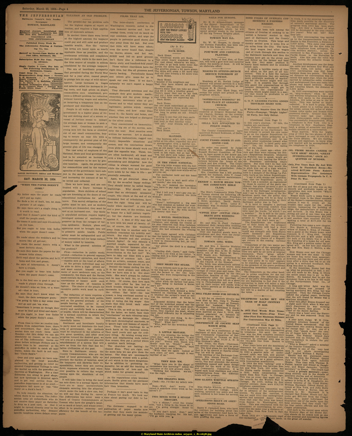 | Saturday, March 22, 1924^-Page 4 THE JEFFERSONIAN, TOWSON, MARYLAND THE JEFFERSONIAN Baltimore County's Only Sunday Newspaper TOWSON, MARYLAND Maryland Journal, Established 1865 Baltimore County Democrat, Eat. 1885 Tke New Era, Established.......1913 Consolidated with THE JEFFERSONIAN Published Every Week By The Jeflersonian Printing: & Publishing; Co., Inc. Entered as Second-Class Matter at the Post Office, Baltimore, Md. Subscription f 1.50 Per Year. Iu Advance. Payable Single Copies, 5 Cents, For Sale At The Following Newsdealers In Baltlomore, County. Court Drug- Co. - - Towson Hera-enrather's Drug: Store - Towson O. H. Michael's - - Relsterstown Henry Crumllch - - Dundalk Mrs. Davis', P. O. Building, Pikesvllle A. C. Davis - - Catonsville Rudolph Deihlman's Store, Catonsville M. T. Cooper's Store - Owings Mills Frank Zlto's Store - Pikesvllle L.OGIE BONNETT, Bditor and Manager SAT. MARCH 22, 1924 •WHEN THE PAPER DOESN'T COME." My father says the paper he reads ain't put up right; He finds a lot of fault, too, he does, purusin' it all night; He says there ain't a single thing in it worth to read, And that it doesn't print the kind of stuff the people need; He tosses it aside and says it's strictly on the bum, But you ought to hear him holler when the paper doesn't come. He reads about the weddin's and he snorts like all get-out; He reads the social doin's with a most derisive shout, He says they make the papers for the women folks alone; He'll read about the parties and he'll fume and fret and groan; He says of information, it doesn't have a crumb, But you ought to hear him holler when the paper doesn't come. He is the first one to grab it and he reads it plumb clean through. He doesen't miss an item, or a want ad—that is true; He says they don't know what we want, the darn newspaper guys; "I'm going to take a day some time and go and put 'em wise; "Sometimes it seems as though they must be deaf and blind and dumb." But you ought to hear him holler when the paper doesn't come. From time to time we receive complaints from subscribers here, there and everywhere, that their Jeffersonian does not reach them until Monday—for this delay we can see absolutely no reason, as the entire run of The Jeffersonian leaves our plant before midnight Fridays and in ample time to be assorted at the postoffice in order to catch all mail trains, hence the fault is not ours, but "Uncle Sam's." Over and over again we have complained to the local postoffice authorities, and getting no relief requested Congressman Tydings to take the matter up with the postoffice authorities at Washington. For a time deliveries ran along in good shape, but now tardiness is detected again and to get real service from the postoffice department is of no avail— complaints fall more or less "like water on a duck's back." To help remedy the situation, for1 which there is no excuse, The Jeffersonian asks all subscribers who do not receive their paper on Saturday to drop us a post card, so that it might be turned directly over' to the postoffice authorities, who demand specific localities where delays occur. TAXATION AN OLD PROBLEM. The present-day tax problem calls for the highest degree of expert attention, and requires a high application of economic science. In ancient times taxes were levied at the highest amount the taxpayer could pay and still exist and produce taxable wealth. Now the various tax levies are based upon as nearly equitable lines as possible, and the continuous criticism and complaints that are made, while in the main just, the true source of trouble is seldom considered by the average taxpayer. , The era of inordinate prosperity that prevailed during the World War and for a year after, caused people to plunge into an orgy of wild extravagance. Large increases in wages and salaries called for increase in living costs, and high prices on staple commodities once established, presents a difficult problem for reduction without lowering wages and salaries, or incurring a temporary loss on the producer and distributor. People in all walks of life became accustomed to a higher plane of living and nothing short of a severe reversal of fortune seems to compel the average man or woman to seek a lower level. Countless numbers of young men left the farm or crowded out of our small communities, hoping to secure an easy life with a consequently the general plan of life large income, and consequently the general plan of life was changed. The vast army of employes of the National, State and local governments had to be awarded an increase in overhead expenses to be met by general taxation. Again, the prices paid for commodities used by the various agencies of the government were subject to the same increase in price, and increasing the amount of tax to be levied and collected. Then we have been, and are confronted with a heavy increase in population. More children of school age are knocking at the doors of our educational institutions for admittance. This sacred obligation of the public must be met, and as modern methods are demanded, they must be met at an increased cost. Our thickly populated sections require highly developed systems of sanitation to preserve us from the ravages of various epidemics. Modern plans and apparatus must be brought into use to preserve public health. Public safety must be safeguarded and all these necessities call for large outlays of money raised by taxation. What is the general solution of the problem? First—reduction in public work; second—reduction in general expense of governmental operation, and third —capable men at the head of affairs. As the private individual may not be able to drive a high priced car and must content himself with a make of more moderate cost, so the community, the State and the Nation must restrain the desire to have every convenience or luxury until such FILMS THAT LIE. The inter-church conference at, Washington recently, called to discuss immoral movies a