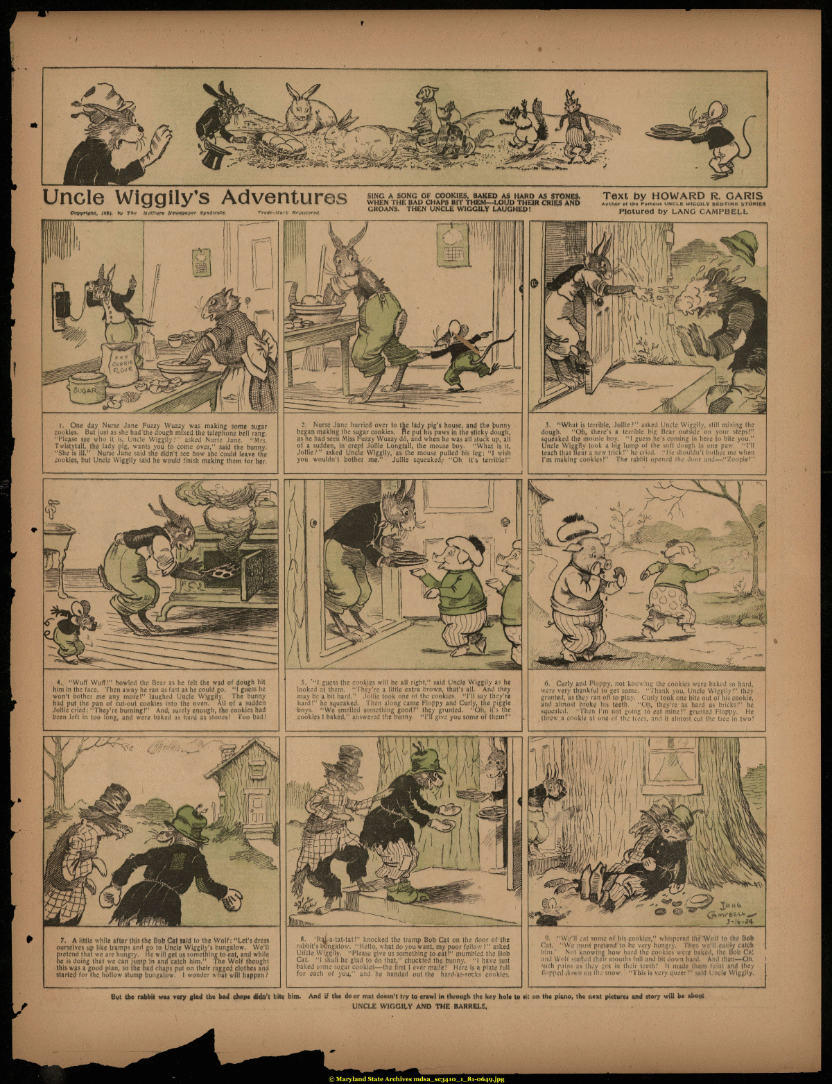| ......I'l "I i !¦¦»—— Unde Wiggily's Adventures Copyright, 1994- *V The McClure Newspaper Syndicate. Trade-Mark Registered, SING A SONG OF COOKIES, BAKED AS HARD AS STONES, WHEN THE BAD CHAPS BIT THEM—LOUD THEIR CRIES AND GROANS. THEN UNCLE WIGGILY LAUGHED! Text by HOWARD R. GARIS Author of the Famous UNCLE WIGGILY BEDTIME STORIES Pictured by LANG CAMPBELL 1. One day Nurse Jane Fuzzy Wuzzy was making some sugar cookies. But just as she had'the dough mixed the telephone bell rang. "Please see who it is, Uncle Wiggily?" asked Nurse Jane. "Mrs. Twistytail, the lady pig, wants you to come over/' said the bunny. "She is ill." Nurse Jane said she didn't see how she could leave the cookies, but Uncle Wiggily said he would finish making them for her. 2. Nurse Jane hurried over to the lady pig's house, and the bunny began making the sugar cookies. Re put his paws in the sticky dough, as he had seen Miss Fuzzy Wuzzy do, and when he was all stuck up, all of a sudden, in crept Jollie Longtail, the mouse boy. "What is it, Jollie?" asked Uncle Wiggily, as the mouse pulled his leg; "1 wish you wouldn't bother me." Jollie squeaked: "Oh, it's terrible!" 3. "What is terrible, Jollie?" asked Uncle Wiggily, still mixing the dough. "Oh, there's a terrible big Bear outside on your steps!" squeaked the mousie boy. "I guess he's coming in here to bite you." Uncle Wiggily took a big lump of the soft dough in one paw. "I'll teach that Bear a new trick!" he cried. "He shouldn't bother rne when I'm making cookies!" The rabbit opened (he door and—"Zoopie!" 4.. "Wuff Wuff!" howled the Bear as he felt the wad of dough hit him in the face. Then away he ran as fast as he could go. "I guess he won't bother me any more!" laughed Uncle Wiggily. The bunny had put the pan of cut-out cookies into the oven. All of a sudden Jollie cried: "They're burning!" And, surely enough, the cookies had been left in too long, and were baked as hard as stones! Too bad! 5. '"I guess the cookies will be all right," said Uncle Wiggily as he looked at them. "They're a little extra brown, that's all. And they may be a bit hard." Jollie took one of the cookies. "I'll say they're hard!" he squeaked. Then along came Floppy and Curly, the piggie boys. "We smelled something good!" they grunted. "Oh, it's the cookies 1 baked," answered the bunny. "I'll give you some of them!" 6. Curly and Floppy, not knowing the cookies were baked so hard, were very thankful to get some. "Thank you, Uncle Wiggily!" they grunted, as they ran of) to play. Curly took one bite out of his cookie, and almost broke his teeth. "Oh, they're as hard as bricks!" he squealed, fjhen I'm not going to eat mine!" grunted Floppy. He threw,a cookie at one of the trees, and it almost cut the tree in two! 7. A little while after this the Bob Cat said to the Wolf: "Let's dress ourselves up like tramps and go to Uncle Wiggily's bungalow. We'll pretend that we are hungry. He will get us something to eat, and while he is doing that we can jump in and catch him." The Wolf thought this was a good plan, so the bad chaps put on their ragged clothes and started for the hollow stump bungalow. I wonder what will happen ? 8. (Raj-a-tat*tat!" knocked the tramp Bob Cat on the door of the rabbit's bungalow. "Hello, what do you want, my poor fellow ?" asked Uncle Wiggily. "Please give us something to eat!" mumbled the Bob Cat. "1 shall be glad to do that," chuckled the bunny. "1 have just baked some sugar cookies—the first 1 ever made! Here is a plate full for each of you,", and. he handed out the hard-as-rorks cookies. 3-lfa-24 9. "We'll eat some of his cookies," whispered thtTWolf to the Bob Cat. "We must pretend to be very hungry. Then we'll easily catch him." Not knowing how hard the cookies were baked, the Bob €?>'. and Wolf nulled their mouihs full and bit down hard. And then—Oh. such pain- as ili.y got in their teeth! it made them faint and they flopped down on the snow. "This is very queer!" said Uncle Wiggily. But the rabbit was very glad the bad chap* didn't lite him. And if the door mat doesn't try to crawl in through the key hole to sit on the piano, the next pictures and story will be about UNCLE WIGGILY AND THE BARRELS, |