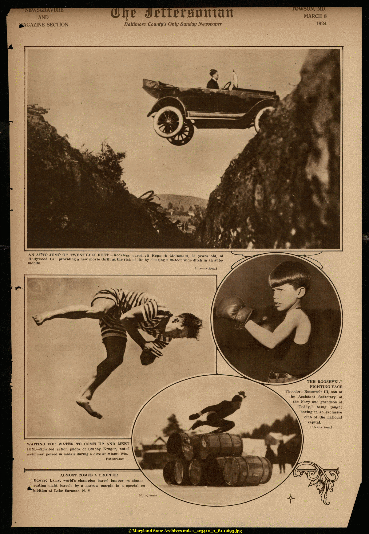 | AND jfc\GAZINE SECTION Baltimore County's Only Sunday Newspaper MARCH 8 1924 AN AltTO JUMP OF TWENTY-SIX FEET.—Reckless daredevil Kenneth McDonald, 25 years old, of Hollywood, Cal., providing a new movie thrill at the risk of life by clearing a 26-foot wide ditch in an automobile. International THE ROOSEVELT FIGHTING FACE Theodore Roosevelt III, son of the Assistant Secretary of the Navy and grandson of "Teddy," being taught boxing in an exclusive club of the national capital. International WAITING FOR WATER TO COME UP AND MEET HIM.—Spirited action photo of Stubby Kruger, noted swimmer, poised in midair during a dive at Miami, Fla. Fotoprrams ALMOST COMES A CROPPER Edward Lamy, world's champion barrel jumper on skates, scaling eight barrels by a narrow margin in a special exhibition at Lake Saranac, N. Y. Fotogram © Maryland State Archives mdsa_sc3410_1_81-0693.jpg |