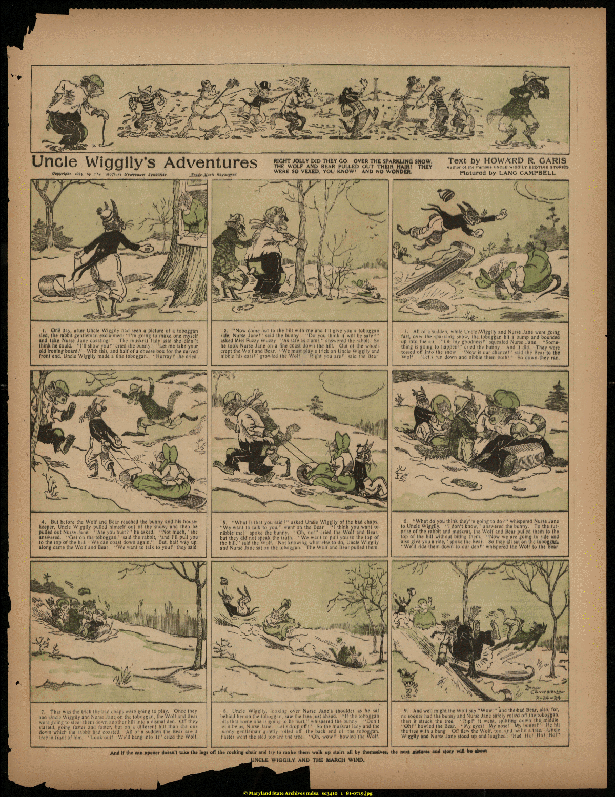 | '-----"—*"**———-—*¦—j— ... . —-----------1-------..........——------h—.------r.„.....—nir'HimwifiwiLir—irimir*"- " ¦*-¦"¦¦ in.......immn Uncle Wiggiiy's Adventures COtnfftffht, t9U, try The McCUre yews?a per Syndicate — i urn in jti nix—¦»——at j/ar/c Registered RIGHT JOLLY DID THEY GO. OVER THE SPARKLING SNOW. T6Xt by HOWARD R. GARIS THE WOLF AND BEAR FULLED OUT THEIR HAIR! THEY Author of the Famous uncle wigcily bedtime stories WERE SO VEXED. YOU KNOW« AND NO WONDER. Pictured by LANG CAMPBELL i. One* day, after Uncle Wiggily had seen a picture of a toboggan sled, the rabbit gentleman exclaimed: "I'm going to. make one myself and take Nurse Jane coasting!" The muskrat lady said she didn"t think he could. "I'll show you'" cried the bunny. "Let me take your old Ironing board." With this, and half of a cheese box for the curved front end, Uncle Wiggily made a tine toboggan. "Hurray!" he cried. u., 4. But before the Wolf and Bear reached the bunny and his housekeeper, Uncle Wiggily pulled himself out of the snow, and then he pulled out Nurse Jane. "Are you hurt ?" he asked. "Not much," she .answered. "Get on the toboggan," said the rabbit, "and I'll pull you to the top of the hill. We can coast down again." But, half way up, along came the Wolf and Bear. "We want to talk to you!" they said. 7. That was the trick the bad chaps were going to play. Once they had Uncle Wiggily and Nurse Jane on the toboggan, the Wolf and Bear were going to steei them down another Hill Into a dismal den. Off they started, going faster and taster, but on a different hill than the one down which the rabbit had coasted. All of a sudden the Bear saw a tree in front of him. "Look out! We'll bang into iti" cried the Wolf. 2. "Now come out to the hill with me and I'll give you a toboggan ride, Nurse Jane!" said the bunrvy "Do you think it will be sale'" asked Miss Fuzzy W'uzzy "As safe as clams," answered the rabbit. So he took Nurse Jane on a tine coast down the hill. Out of the woods crept the Wolf and Bear. "We must play a trick on Uncle Wiggilv and nibble his ears'" growled the Wolf "Right you are'" said the Bear 3. All of a sudden, while Uncle Wiggily and Nurse Jane were going fast, over the sparkling snow, the toboggan hit a bump and bounced up into the air "Oh my goodness'" squealed Nurse Jane. "Something is going to happen'" cried the bunny And it did They were tossed off into the snow "Now is our chance!" said the Bear to the Wolf "Let's run down and nibble them both'" So down.they ran. 5. "What is that you said ?" asked Ungle Wiggily of the bad chaps. "We want to talk to you," went on the Bear '•! think you want to nibble me!" spoke the bunny. "Oh, no'" cried the Wolf and Bear, but they did not speak the truth. "We want to pull you to the top of the hill," said the Wolf. Not knowing what else to do, Uncle Wiggily and Nurse Jane sat on the toboggan. The Wolf and Bear pulled them. 6. "What do you think they're going to do ?" whispered Nurse Jane to Uncle Wiggily. "1 don't know," answered the bunny. To the surprise of the rabbit and muskrat, the Wolf and Bear pulled them to the top of the hill without biting them. "Now we are going to ride and also give you a ride," spoke the Bear. So they all sat on the tobofgUL "We'll ride them down to our den'" whispered the Wolf to the Bear M !t: r i ii i ir 8. Uncle Wiggilv, looking over Nurse Jane's shoulder as he sat behind her on the toboggan, saw the tree just ahead. "If the toboggan hits that sorril one is going to be hurt," whispered the bunny "Don't let it be us, Nurse Jane. Let's drop off!" So the muskrat lady and the bunny gentleman quietly rolled off the back end of the toboggan. Faster went the sled toward the tree. "Oh, wow!" howled the Wolf. 9. And well might the Wolf say "Wow!" and the»bad Bear, also, for, no sooner had the bunny and Nurse Jane safely rolled off the toboggan, than it struck the tree' "Rip!" it went, splitting down the. middle. "Oh!" howled the Bear. "My eyes! My nose! M5y bones!" He hit the tree with a bang Off flew the Wolf, too, and he hit a tree. Uncle Wiggily and Nurse Jane stood up and laughed: "Ha>! Ha! Ho! Hot" And if the can opener doesn't take the legs off the rocking chair and try to make them walk up stairs all hy themaelvt*. the next pictures and ttory will b# about NCLE WIGGILY AND THE MARCH WIND. |