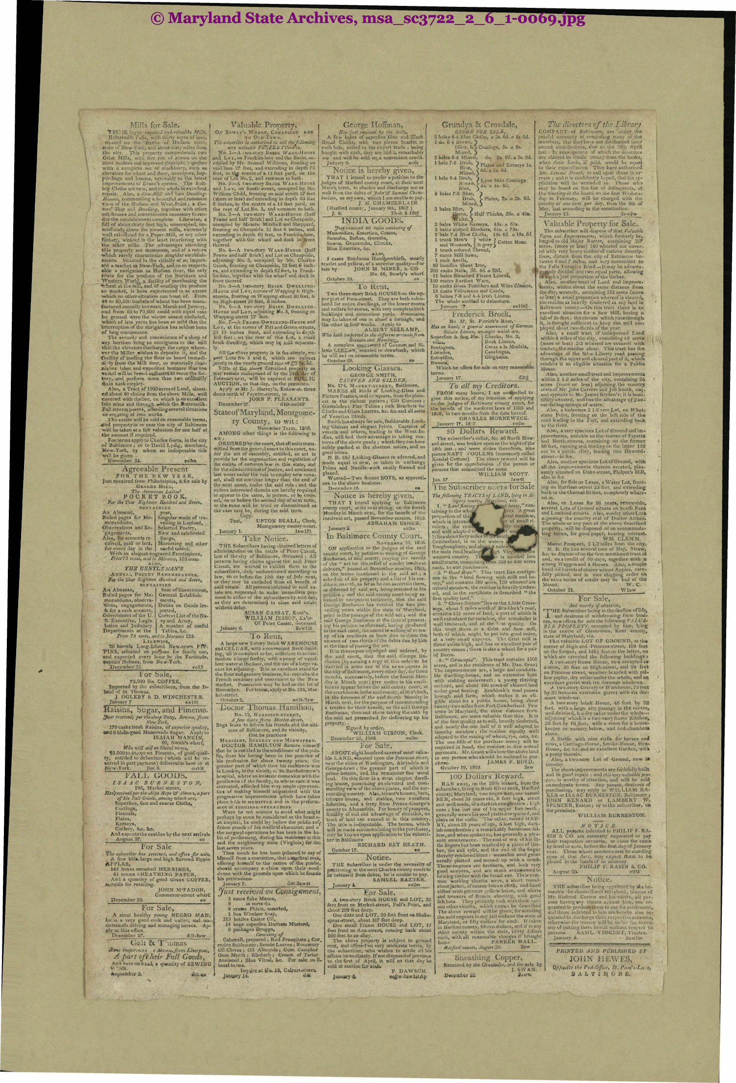 Federal Gazette & Baltimore Daily Advertiser 1807/01-1807/06 msa_sc3722_2_6_1-0069 Enlarge and print image (4M)      |