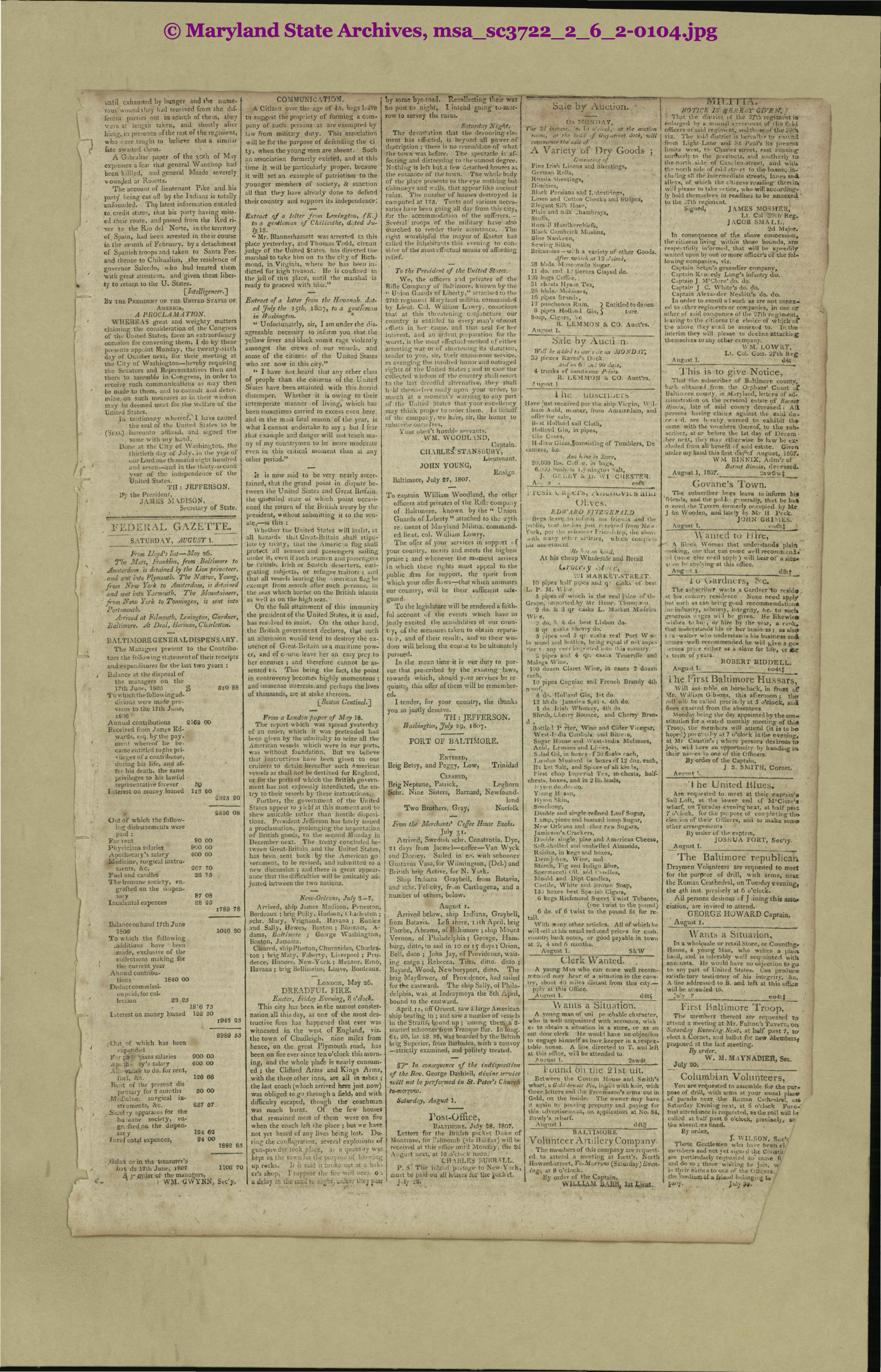 Federal Gazette & Baltimore Daily Advertiser 1807/07-1807/12 msa_sc3722_2_6_2-0104 Enlarge and print image (5M)      |