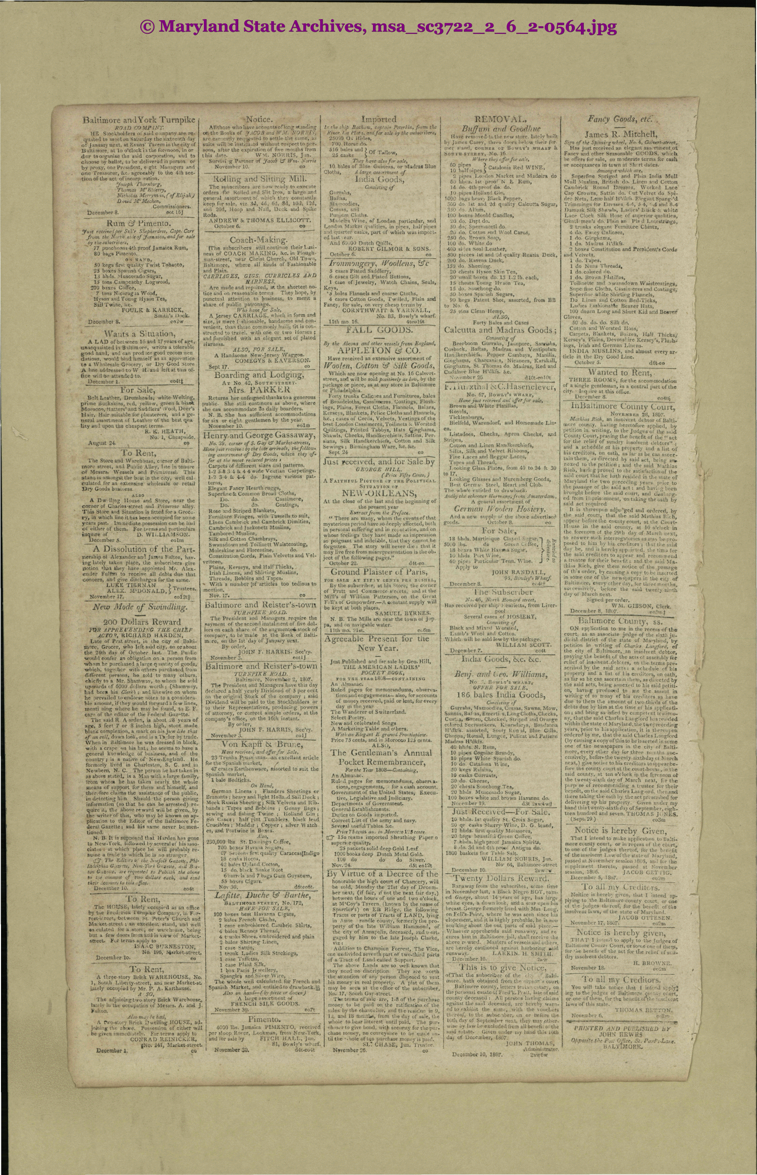 Federal Gazette & Baltimore Daily Advertiser 1807/07-1807/12 msa_sc3722_2_6_2-0564 Enlarge and print image (5M)      |