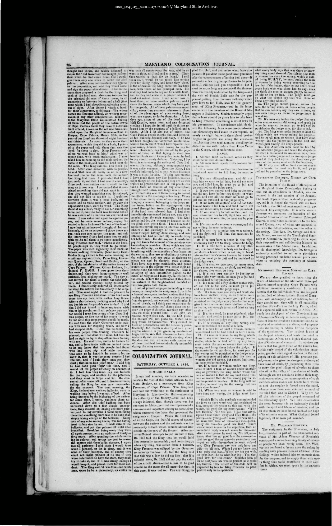 Maryland State Archives Maryland Colonization Journal Collection MSA SC 4303 msa_sc4303_scm11070-0026 Enlarge and print image (4M)      |