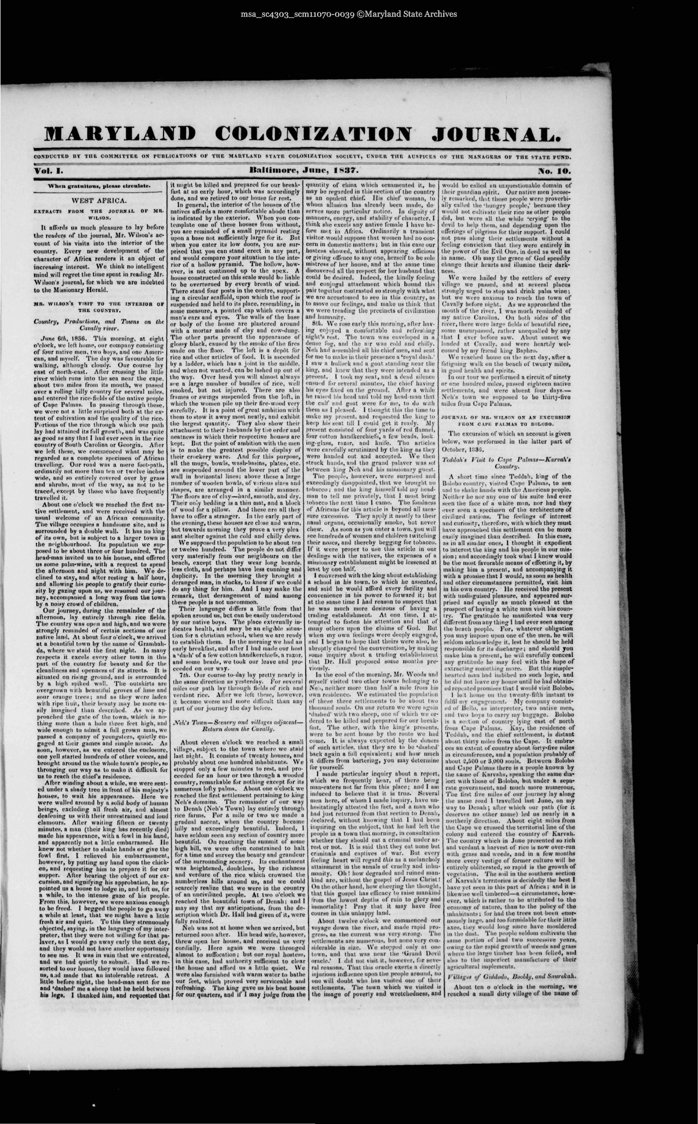 | MARYLAND COLONIZATION JOURNAL. CONDUCTED l!Y THE COMMITTEE ON PUBLICATIONS OP THE MARYLAND STATE COLONIZATION SOCIETY, UNDER THE AUSPICES OP THE MANAGERS OF THE STATE FUND. Vol. I. Baltimore. June, 1837. No. 10. When gratuitous, please circulate. WEST AFRICA. EXTRACTS FROM THE JOURNAL OF MR. WILSON. It affords us much pleasure to lay before the readers of tlic journal, Mr. Wilson's ac- count of liis visits into the interior of the country. Every new development of the character of Africa renders it on object of increasing interest. We think no intelligent mind will regret the time spent in reading Mr. Wilson's journal, for which we are indebted to the Missionary Herald. MR. WILSON'S VISIT TO THE INTERIOR OF THE COUNTRY. Country, Productions, and Towns on the. Cavally river. June 6th, 1836. This morning, at eight o'clock, we left home, our company consisting of four native men, two boys, and MM Ameri- can, anil myself. The day was favourable lor walking, although cloudy. Our Course lay east Of north-cast. After crossing the little river which runs into the sea near the cape. about two miles from its mouth, we passed over a rolling hilly country for several miles, ami entered the rice-fields of the native people of Cape I'ahnas. hi passing through these, wo were not a little surprised both at the ex- tent of cultivation ami the quality of the rice. Portions of the rice through Which our path lay hod attained its full growth, anil was quite as gooil as any that I hail ever seen in the rice country of South Carolina or Georgia. Afler we left these, we commenced what mav be regarded as a complete specimen of African travelling. Our road was a mere foot-path, ordinarily not more than ten or twelve inches wide, ami so entirely covered over by grass and shrubs, most of the way, as not to be traced, except by those who have frequently travelled it. About one o'clock we reached the first na- tive settlement, and were received with the usual welcome of an African community. The village occupies a handsome site, and is surrounded by a double wall. It has no king of its own, but is subject to a larger town in the neighbourhood. Its population we sup- posed to be about three or four hundred. The head-man invited us to his house, and offered us some palm-wine, with a request to spend the afternoon and night with him. We de- clined to stay, and alter resting a half hour, and allowing his people to grotify their curio- sity by gazing upon us, we resumed our jour- ney, accompanied a long way from the town by a noisy crowd of children. Our journey, during the remainder of the afternoon, lay entirely through rice fields. The country was open and high, and we were strongly reminded of certain sections of our native land. At about four o'clock, we arrived at a beautiful town by the name of Crutnbuh- da, where we staid the first night, hi many respects it excels every other town in this purl of the country for beauty and for the cleanliness and openness of its streets. It is situated on rising ground, and is surrounded by a high spiked wall. The outskirts are overgrown with beautiful groves of lime and sour orange trees; and us they were laden with ripe fruit, their beauty may be more ea- sily imagined than described. As we ap- proached the gate of the town, which is no- thing more than a hule three feet high, and wide enough to admit a full grown man, we passed a company of youngsters, quietly en- gaged at their games ami simple music. As soon, however, as we entered the enelosure, one yell started hundreds of other voices, and brought around us the whole town's people, n> thronging our way ns to make it difficult tor ns to reach the chief's residence. After winding about a while, we were seat- ed under a shady tree in front of his majesty's houses, to wait his appearance. Here we were walled around by a solid body of human beings, excluding all fresh air, and almost deafening U9 with their unrestrained and loud clamours. After wailing fifteen or twenty minutes, a man (their king has recently died) made his appearance, with a fowl in his bund, and apparently not a little embarrassed. He knew not whether to shake hands or give the fowl first. I relieved his embarrassment, however, by putting my hund upon the chick- en, and requesting him lo prepare it for our supper. After hearing the object of our ex- cursion, and signifying his approbation, he ap- pointed us a house to lodge in, and left us, for a while, to the intense gaze of his people. From this, however, we were anxious enough to be freed. I begged the people to go awoy a while at least, that we might have a little fresh air and quiet. To this they strenuously objected, saying, in the language of my inter- preter, that they were not willing fur that pa- laver, as I would go away early the next day, and they would not have another Opportunity to see me. It was in vuin that we entreated, and we hud quietly to submit. Hud we re- sorted to our house, they would iiave followed us, a.id made that an intolerable retreat. A little before night, the head-man sent for me and 'dashed' me a sheep that he held between his legs. I thanked him, and requested that it might be killed and prepared tor our break- fast at itri early hour, which was accordingly done, and we retired to our house tor rest. In general the interior of the houses of the natives affords a more comfortable abode thnn is indicated by the exterior. When you con- template one of these houses from without, you are reminded of a small pyramid rating upon a base not sufficiently lurge for it. But when you enter its low doors, you arc sur- prised that you can stand erect iu any part, and would compare your situation to the inte- rior of u hollow pyramid. The hollow, how- ever, is not continued up to the apex. A house constructed on this scale would be liable to bo overturned by every breath of wind. There stand four posts in the centre, support- ing a circular scaffold, upon which the roof is suspended 