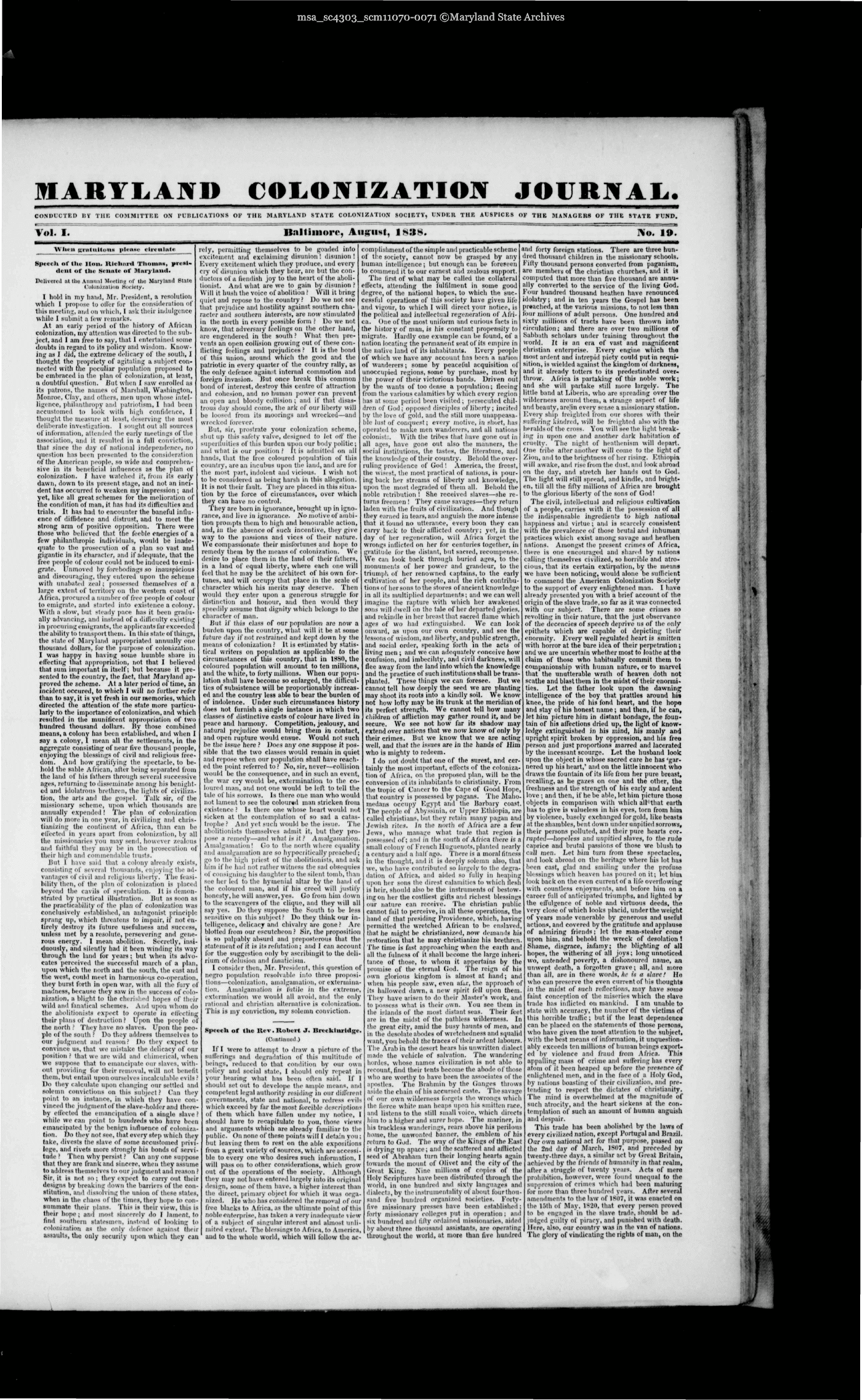 | MARYLAND COLONIZATION JOURNAL. CONDUCTED BY THE COMMITTEE ON PUBLICATIONS OF THE MARYLAND STATE COLONIZATION SOCIETY, UNDER THE AUSPICES OF THE MANAGERS OF THE STATE FUND. Vol. I. Baltimore, August, 1838. No. 19. when gratuitous please circulate Speech of the Hon. Richard Thomas,presi- dent of the Senate of Maryland. Delivered at the Annual Meeting of' the Maryland State Colonization Society. I hold in my hand, Mr. President, a resolution which I propose to offerfor the consideration of this meeting, and on which, I ask their indulgence while 1 submit a low remarks. At an early period of the history of African colonization, my attention was directed to the sub- ject, and I am free to say, that I entertained some doubts in regard to its policy and wisdom. Know- ing as I did, the extreme delicacy of the south, I thought the propriety of agitating a subject con- nected with the peculiar population proposed to lie embraced in the plan of colonization, at least, u doubtful ipiestion. But when I saw enrolled as its patrons, the names of Marshall, Washington, Monroe. Clay, and others, men upon whose intel- ligence, philanthropy and patriotism, I had been accustomed to look with high confidence, I thought the measure at least, deserving the most deliberate investigation. I sought out all sources of information, attended the early meetings of the association, and it molted in a full conviction, that since the day of national independence, no (piestion has been presented to the consideration of the American people, so wide and comprehen- sive in its beneficial inlluences as the plan of colonization. 1 have walched it, from its early dawn, down to its present stage, and not an inci- dent has occurred to weaken my impression; and yet, like all great schemes for the melioration of the condition of man, it has had its difficulties and trials. It has had to encounter the baneful infill- ence of difndence and distrust, and to meet the strong arm of positive opposition. There were those who believed that the feeble energies of a few philanthropic indi\ iduals, would be inade- quate to the prosecution of a plan so vast and gigantic in its character, and If adequate, that the free people of colour could not he induced to emi- grate. Unmoved by forebodings n inauspicious and dilcouraging, they entered upon the scheme with unabated zeal; possessed themselves of a ItrM extent of territory on the western coast of Africa, procured a number of free people of colour to emigrate, and started into existence a colony. With a slow, but steady pace has it been gradu- ally advancing, and instead of a difficulty existing in procuring emigrant!, the applicants far exceeded the ability to transport thoin. In this state of things, the state of Maryland appropriated annually one thousand dollars, for the purpose of colonization. I was happy in having some humble share in effecting that appropriation, not that I believed that sum Important in itself; but because it pre- sented to the country, the fact, that Maryland ap- proved the scheme. At a later period oi'tiine, an incident occured, to which I will no further refer than to say, it is yet fresh in our memories, which directed the attention of the state more particu- larly to the importance of colonization, and which resulted in the munificent appropriation of two hundred thousand dollars. By those combined means, a colony has been established, and when I say a colony, I mean all the settlements, in the aggregate consisting of near five thousand people, enjoying the blessings of civil and religious free- dom. And how gratifying the spectacle, to he- hold the sable African, after being separated from the land of his fathers through several successive ages, returning to disseminate among his benight- ed and idolatrous brethren, the light! of civiliza- tion, the arts and the goepel. Talk sir, of the missionary scheme, upon which thousands are annually expended ! i'he plan of colonization will do more in one year, in civilizing and chris- tianizing the continent of Africa, than can be effected in years apart from colonization, by all the missionaries you may send, however zealous and faithful they may be in the prosecution of their high anil commend able dusts. Hut 1 have said that a colony already exists, consisting of several thousands, enjoying the ad- vantages of civil and rellgioui liberty. The feaii- liility then, of the plan of colonization is placed beyond the cavils of speculation. It is demon- strated by practical illustration. But as soon as the practicability of the plan of colonization was conclusively established, an antagonist principle sprang up, which threatens to impair, if not en- tirely destroy its future usefulness and success, unless met by a resolute, persevering and gene- rous energy. I mean abolition. Secretly, insi- duously, and silently had it been windfall its way through the land for years ; but when its advo- cates perceived the successful march of a plan, upon which the north and the south, the east and the west, could meet in harmonious co-operation, they burst forth in open war, with all the fury of madness, because they saw in the success of colo- nization, a blight to the cherUhed hopes of tin ir wild and fanatical schemes. And upon whom do the abolitionists expect to operate in effecting their plans of destruction ? Upon the people of the north ? They have no slaves. Upon the peo- ple of the south ? Do they address themselves to our judgment and reason? Do they expect to convince us, that we mistake the delicacy of our position ? that we are wild and chimerical, when we suppose that to emancipate our slaves, with- out providing for their removal, will not benefit them, but entail upon ourselves incalculable evils! Do they calculate upon changing our settled and solemn convictions on this subject ? Can they point to an instance, in which they have con- vinced the Judgment of the slave-holder and there- by eli'ected the emancipation of a sin