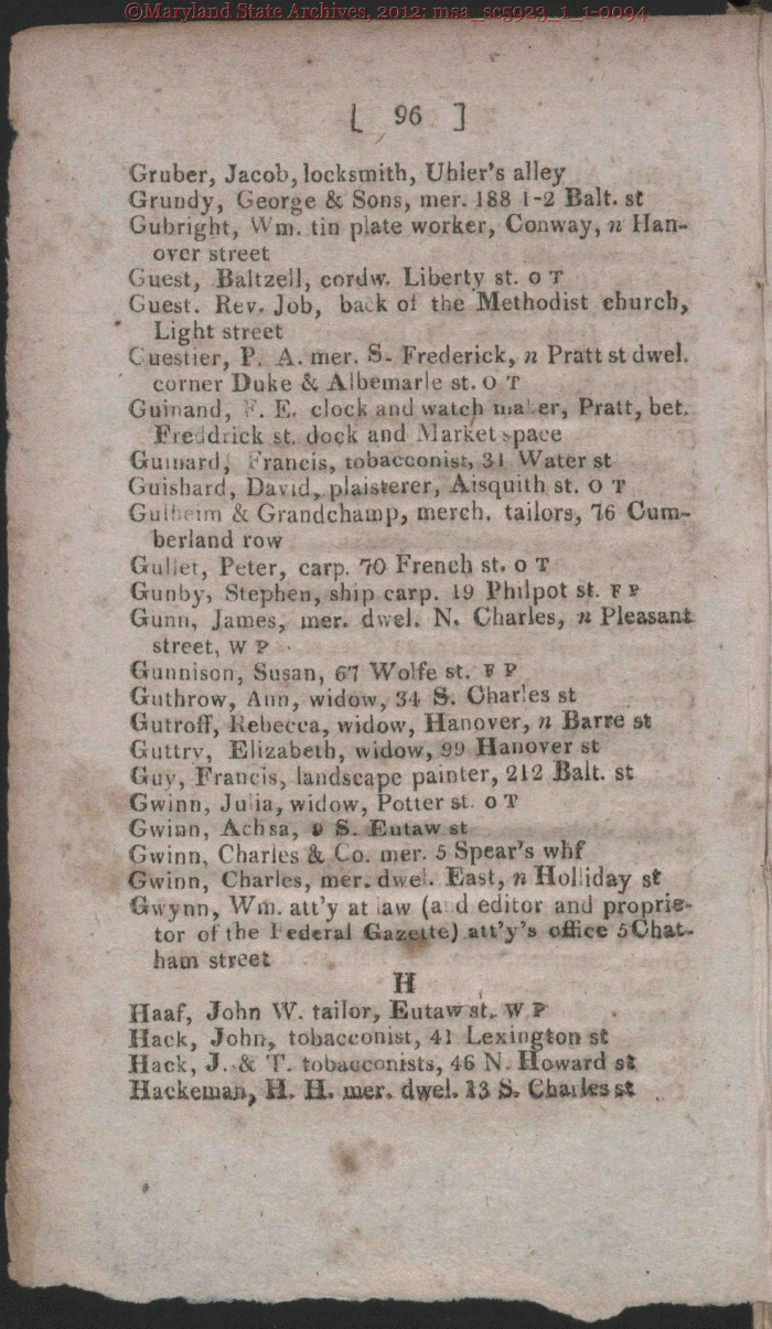 | 96 y Gruber, Jacob, locksmith, Uhler's alley Grundy, George & Sons, mer. 188 1-2 Bait, st ay over street Guest, Baltzeil, cordw. Liberty st. o T Guest. Rev. Job, back of the Methodist church, Light street Cuestier, P. A. mer. S. Frederick, n Pratt st dwel, corner Duke & Albemarle st. O T Guinand, . E. clock and watch ma er, Pratt, bet, Fie idiick st. dock and Market.space Gurnard, Francis, tobacconist, 3i Water st Guishard, David, plaisfcerer, Aisquith st. o T Gut' im & Grandchamp, merch. tailors, 16 Cum- berland row Gullet, Peter, carp. 70 French st. o T Gunby, Stephen, ship carp. 19 Philpot st. F? Gunn, James, mer. dwek N* Charles, n Pleasant treet, w P Wolfe Guthrow, Ann, widow, S4 S-. Charles st Gutroff, Rebecca, widow, Hanover, n Bar Guttrv, Elizabeth, widow, 99 Hanover st Guv, Francis, landscape painter, 212 Bait Gwinn, Ju ia, widow, Potter st- o T Gwion, Achsa, V S. Eutaw st Gwinn, Charles & Co. mer. 5 SpearTs whf Wm. att'v at ,aw (a d Holliday tor of the 1 edcral Gazette) att'y's office 5Chat- ham street H Haaf, John W. tailor, Eutaw st. W F Hack, John, tobacconist, 41 Lexington st H award si Hacketuaju HL H. mer> dwel. 1$ & Cba-iks |