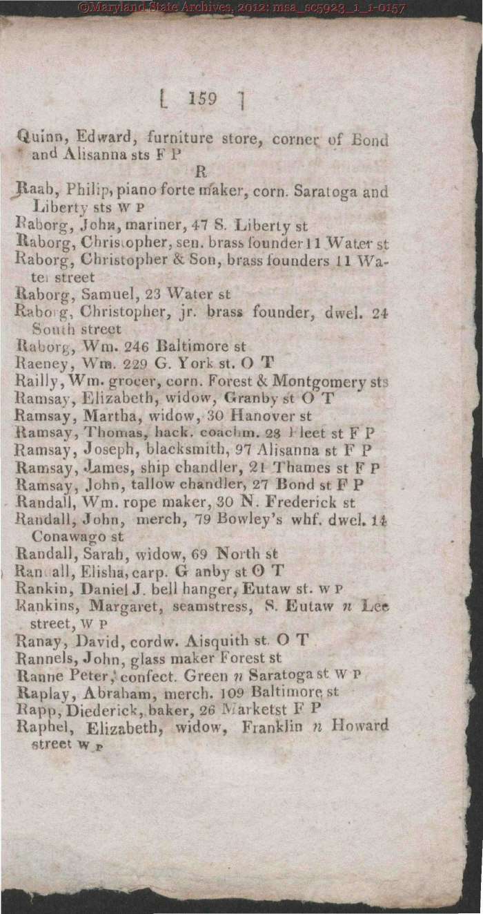 | / 159 Qulnn, Edward, furniture store, corner of Bond and Alisanna sts F I R Jlaab, Philip, piano forte maker, corn. Saratoga and Liberty sts W P Rahorg, Joha, mariner, 47 S. Liberty st Raborg, Chris,opher, sen. brass founder 11 Water st Raborg, Christopher & Son, brass founders 11 Wa- tei street Raborg, Samuel, 23 Water st Raborg, Christopher, jr. brass founder, dwel. 24 South street Rabprg, Win. 246 Baltimore st Raeney, Wra. 22(> G. York st. O T Railly, Win. grocer, corn. Forest & Montgomery sts Ramsay, Elizabeth, widow, Granby st O T Ramsay, Martha, widow, 30 Hanover st Ramsay, Thomas, hack, eoachm. 23 i leet st F P Ramsay, Joseph, blacksmith, 97 Alisanna st F P Ramsay, Jlames, ship chandler, 21 Thames st F P Ramsay, John, tallow chandler, 27 Bond st F P - Randall, Wm. rope maker, 30 N. Frederick st Randall, John, merch, 79 Bowley's whf. dwcK 14 Conawago st Randall, Sarah, widow, (59 North st Ran all, Klisha, carp. Gr anby st O T Rankin, Daniel J. bell hanger, Eutaw st- w P Rankins, Margaret, seamstress, S. Eutaw n Lee street, W P Ranay, David, cordw. Aisquith st. O T Rannels, John, glass maker Forest st Ranne Peter, confect. Green n Saratoga st w P Raplay, Abraham, merch. 109 Baltimore st Rapp, Diederick, baker, 26 iVarketst E P Raphel, Elizabeth, widow, Franklin n Howard street w p |