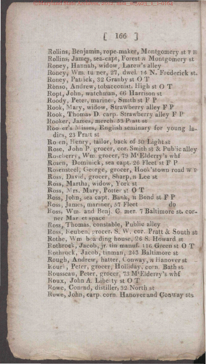 | 166 ose, John P. grocer, cor. Smith st & Pub'ic alley oseberry, Wm, grocer, 79 M'Elderry's whf Honey, Patiick, 32 Granby st O T Rbnso, Andrew, tobacconist, High st O T Ropt, John, watchman, 66 Harrison st Boody, Peter, mariner, Smith st F P Rook, Mary, widow, Strawberry alley F P Rook, Thomas D. carp. Strawberry alley F P Booker, James, merch. 53 Piatt st Roo er's A isses, English seminary for young la- dies, 23 Pratt st Ro en, Henry, tailor, back of 50 Light st Rose R Rosen, Dominick, sea capt. 26 Fleet st F P Rosensteel, George, grocer, Hook'stown road w V Ross, David, grocer, Sharp,n Lee st Ross, Martha, widow, York st Ross, Mrs. Mary, Potter st O T Ross, Johnj. sea capt. Bank, n Bond st F P Ross, James, manner, 57 Fleet do Boss, Wm. and Benj. G. mer. 7 Baltimore st. cor- ner Mar et space Ross, Thomas, constable, Public alley Boss, 1 euben, procer, S, W. cor. Pratt & South st Rothe, Wm boa ding house, 26 S. Howard st Bothrock, Jacob, jr. tin manuf. 116 Green st O T Borbrock, Jacob, tinman, 243 Baltimore st Rough, Andrew, hatter, ( on way, n Hanover st Bour! , Peter, grocer, Holliday, com. Bath st Bousseau, Peter, grocer. 73 M'Eiderry's whf Boux, John A. Libeity st O T Bowe, Conrad, distiller, 32 North st Bcwe> John, carp, corn, Hanover and Conway sts Boliins, Benjamin, rope-maker, Montgomery st ? H Rollins, James, sea-capt, Forest n Montgomery st Boney, Hannah, widow, Larew's alley Honey, Wm. tuner, 27, dwel. 14 N. Frederick st* |