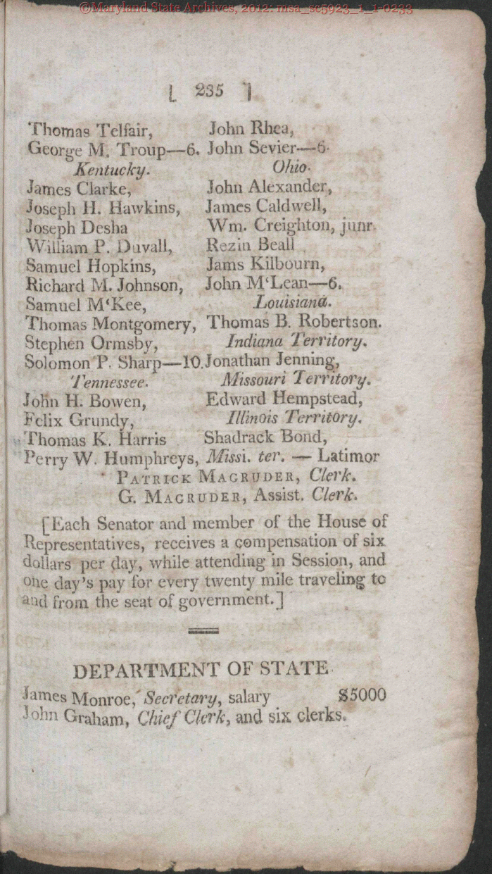 | 235 Thomas Telfair George M. Troup Kentucky. James Clarke, Joseph 11. Hawk Joseph Desha William P. Davi Samuel Hop! John Rhea John Sevie > Ohio John Alexander, James Caldwell, Wm, Creighton, j Rczin Beall Jams Kilbourn, Rich M. Johnson, John MT 6. Samuel M'K L Thomas Montgomery, Thomas B. Robert Stephen Ormsby, Indiana Territor Solomon P. Sharp-10.Jonathan Jenning Tennessee. John H. Bowen, Felix Grundy, Thomas K. Harris Missouri Territory, Edward Hempstead, Illin ois Territory, Shadrack Bond, DLatimor Perry W. Humphreys, Musi. ter. ' Patrick Magruder, Clerk. G. Magruder, Assist. Clerk. FEaeh Senator and member of the House of Re of 9 þ* day, while attending in Session, and ilay's pay for every twenty ] S - DEPARTMENT OF STATE imes Monroe,' Secretary, salary John Graham, Chief Clerk, and six clerks $5000 |