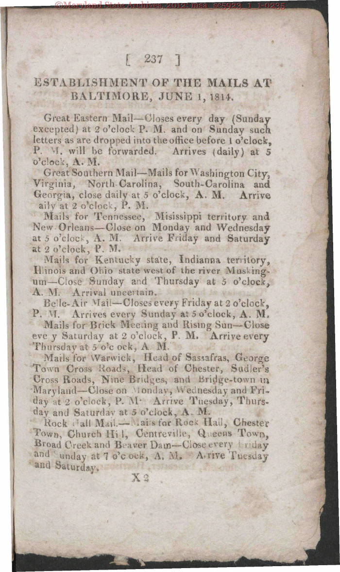 | i 237 ESTABLISHMENT OF THE MAILS AT BALTIMORE, JUNE 1, 1814. Great Eastern Mail-Closes every day (Sunday excepted) at 2 o'clock P. M. and on Sunday such letters as are dropped into the office before I o'clock* P. VT. will be forwarded. oVock, A. M. Arrives (daily) at V 5 Great Southern Mail-Mails for Washington City, Virginia, North Carolina, South-Carolina and Georgia, close daily at 5 o'clock, A. M. Arrive aily at 2 o'cloc , P. M. Mails for Tennessee, Misissippi territory and New Orleans-Close on Monday and Wednesday at 5 o'cloc , A. M. Arrive Friday and Saturday at 2 o'clock, P. M. Mails for Kentucky state, Indianna territory Ilinois and Ohio state west of the river JVIusking- urn-Close Sunday and Thursday at 5 o'clock, A. \f. Arrival uncertain. Belle-Air VTail-Closes every Friday at 2 o'clock, P. \T. Arrives every Sunday a* 5 o'clock, A. M Mails for Brick Meeting and Rising Sun-Close eve y Saturday at 2 o'clock, P. M. Arrive every Thursday at 5 o'c ock, A M, s> Mails for Warwick, Head of Sassafras, George Toun Cross i^oads, Head of Chester, SudJer's Cross Roads, Nine Bridges, and bridge-town if) Maryland-Close on ondav, V* ednesday and Fri- day t 2 o'clock, P. M/ Arrive Tuesday, Thurs- day and Saturday at 5 o'clock, A- M. Rock - all Mail.- lai's-fofRock Hall, Chester Town, Church Hi 1, Centreviiu*, Q eons Town, ^road Creek and Beaver Dam-Ciosc every ay ar)d ' unday at 7 o'c ock, A; % Arrive Ti ay ,,M(1 Saturday, X2 . |