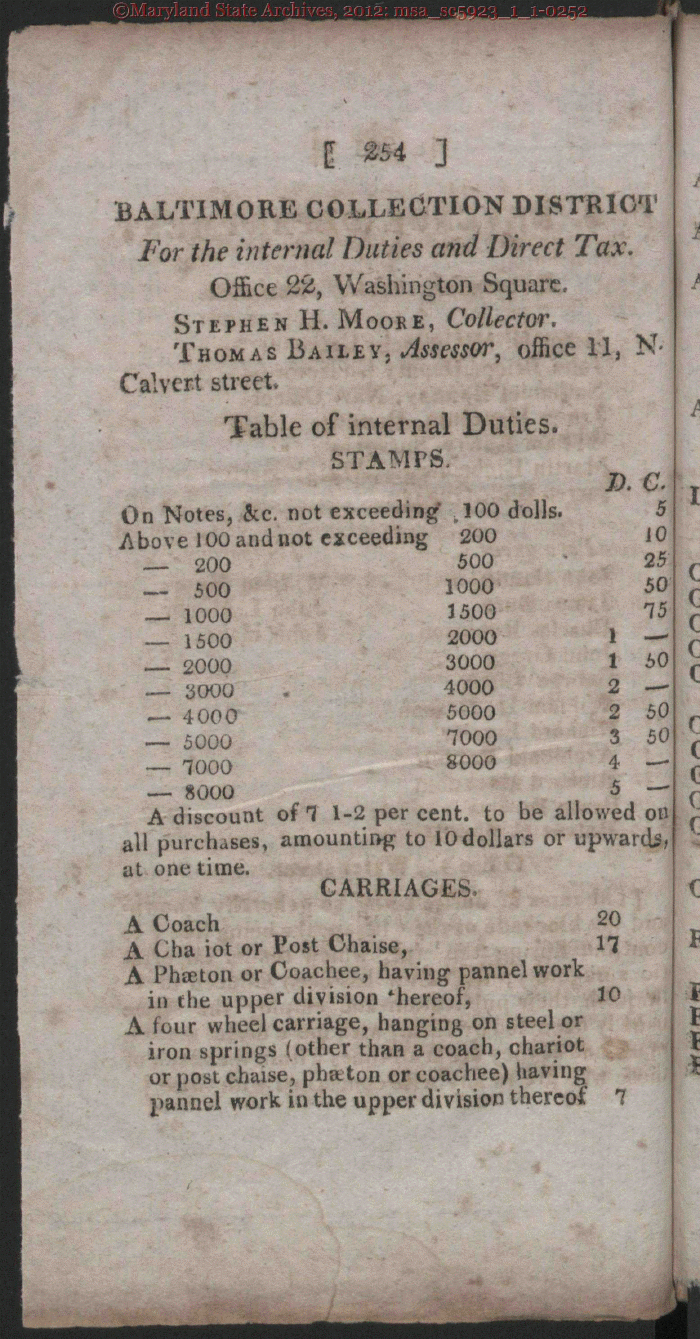 | $œ4 BALTIMORE COLLECTION DISTRICT For the internal Duties and Direct Tax. Office 22, Washington Square. Stephen H. Moore, Collector. Thomas Bailey, Assessor, office 11, N< Calvert street. Table of internal Duties. STAMPS. On Notes, &.c. not exceeding .100 dolls. Above 100 and not exceeding 200 - 500 1000 1500 2000 3000 4000 5000 7000 8000 200 500 1000 1500 2000 3000 4000 5000 7000 8000 J). C 5 25 50 75 1 r 1 50 2 ^ 2 50 3 50 4 5 A discount of 7 1-2 per cent, to be allowed on all purchases, amounting to 10 dollars or upwards at one lime. CARRIAGES 20 10 A Coach A Cha iot or Post Chaise, A Phaeton or Coachee, having pannelwork in the upper division 'hereof, j A four wheel carriage, hanging on steel or iron springs (other than a coach, chariot or post chaise, phaton or coachee) having pannel work in the upper division thereof 7 |