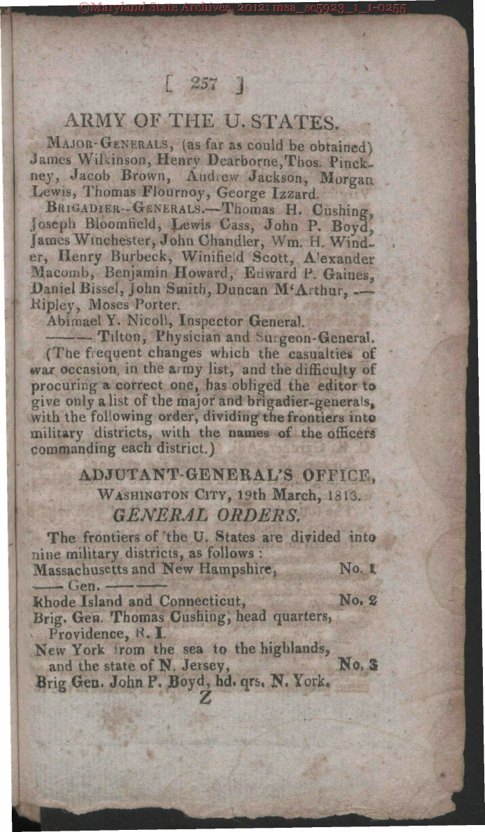 | / 257 ARMY OF THE U. STATES. Major-Generals, (as far as could be obtained James Wilkinson, Henry Dearborne,Thos. Pinck- ney, Jacob Brown, And Żew Jackson, Morgan Lewis, Thomas FJournoy, George Izzard, Brigadier-Generals.-Thomas H. Gushing, Joseph Bloomtield, Lewis Cass, John P. Boyd, James Winchester, John Chandler, Win. H. Wind- er, Henry Burbeck, Winifield Scott, A'exander Macomb, Benjamin Howard, Edward P. Gaines, Daniel Bissel, John Smith, Duncan M'Arthur, . KipJey, Moses Porter. Abimael Y. Nicoll, Inspector General. Tilton, Physician and geon-General. (The frequent changes which the casualties of ivar occasion, in the army list, and the difficulty of procuring a correct one, has obliged the editor to give only a list of the major and brigadier-generals^ with the following order, dividing the frontiers into military districts, with the names of the officer^ commanding each district.) ADJUTANT-GENERAL'S OFFICE, Washington City, 19th March, 1813. GENERAL ORDERS. The frontiers of the U. States are divided into nine military districts, as follows : Massachusetts and New Hampshire* No. I i ien. Rhode Island and Connecticut, No Th I i N N to the highlands, No Brig Gen. John P. Boyd, hd. qrs, N. York |