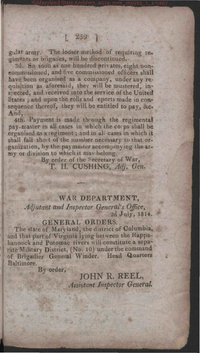| 159 gular army. The looser method of requiring re- giments or brigades, will be discontinued. 3d. So soon as one hundred privates, eight non- commissioned, and five commissioned officers shall have been organised as a company, under any re- quisition ¯s aforesaid, they will be mustered, in- spected, and leceived into the service of the United States ; and upon the rolls and eports made in con- sequence thereof, they will be entitled to pay, &c® And, 4th. Payment is made through the regimental pay-master in all cases in which the corps shall be organised as a egiment; and in ah cases in which it shall fall shoit of the number necessary to that or- ganization, by the paymaster accompanying the ar- my or division to which it may belong. By order of the Secretary of War, T. H. CUSH1NG, Adj. Gen. WAR DEPARTMENT, Adjutant and Inspector* General's Office', 2d July, 1814. GENERAL ORDERS. The slate of Maryland, the district of Columbia and that part of Virginia lying between the Kappa- bannock and Potomac rivers will constitute a sepa-¯ rate Military District, (No. 10) under the command of Brigadier General Winder. Head Quarters Baltimore. i By order, JOHN R. REEL, Assistant Inspector General. |