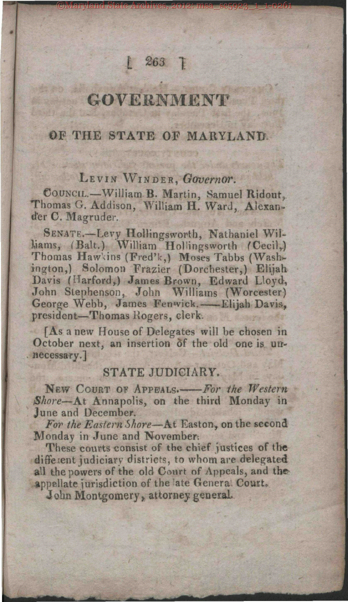 | # GOVERNMENT OF THE STATE OF MARYLAND. Levin Winder, Governor. Council.-William-B. Martin, Samuel Ridout, Thomas G. Addison, William EL Ward, Alexan- der C. Magruder. Senate.-Levy HoUingsworth, Nathaniel Wil- liams, (Bait.) 'William HoUingsworth fCecil,) Thomas Hawkins (Fred'k,) Moses Tabbs (Wash- ington,) Solomon Frazier (Dorchester,) Elijah Davis (Harford,.) James Brown, Edward Lloyd, John Stephenson, John Williams (Worcester) George Webb, James Fcnwick.--Elijah Davis, president-Thomas Rogers, clerk. [As a new House of Delegates will be chosen in October next, an insertion of the old one is im- necessary.] STATE JUDICIARY. New Court of Appeals.------For the Western Shore-At Annapolis, on the third Monday in June and December. For the Eastern Shore-At Easton, on the second Monday in June and November: These courts consist of the chief justices of tlye diffeient judiciary districts, to whom are delegated all the powers of the old Court of Appeals, and the appellate jurisdiction of the ate Genera Court. John Montgomery* attorney general- |