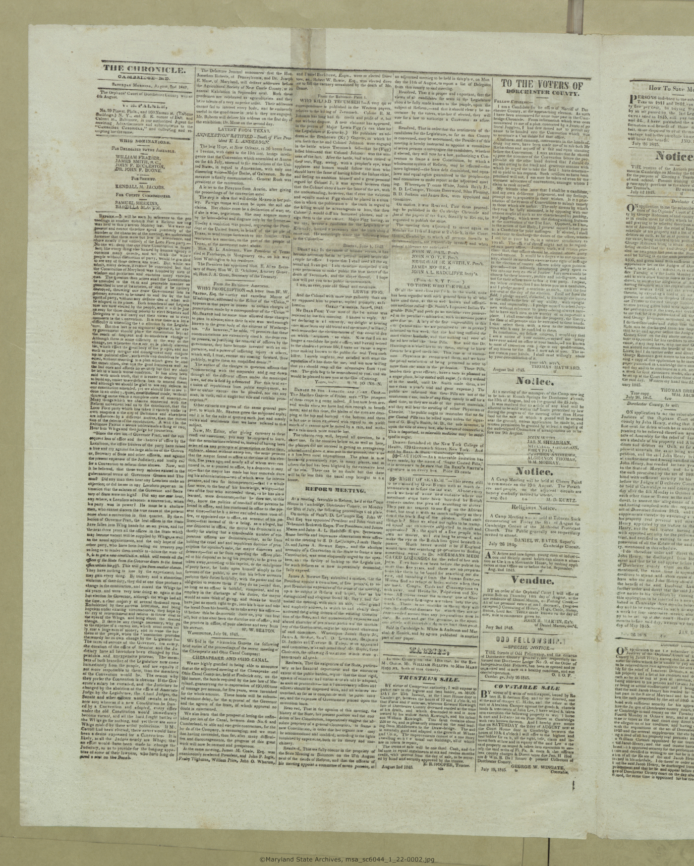 Maryland State Archives Dorchester County Historical Society Newspaper Collection MSA SC 6044 The Cambridge Chronicle msa_sc6044_1_22-0002 Enlarge and print image (12M)      |