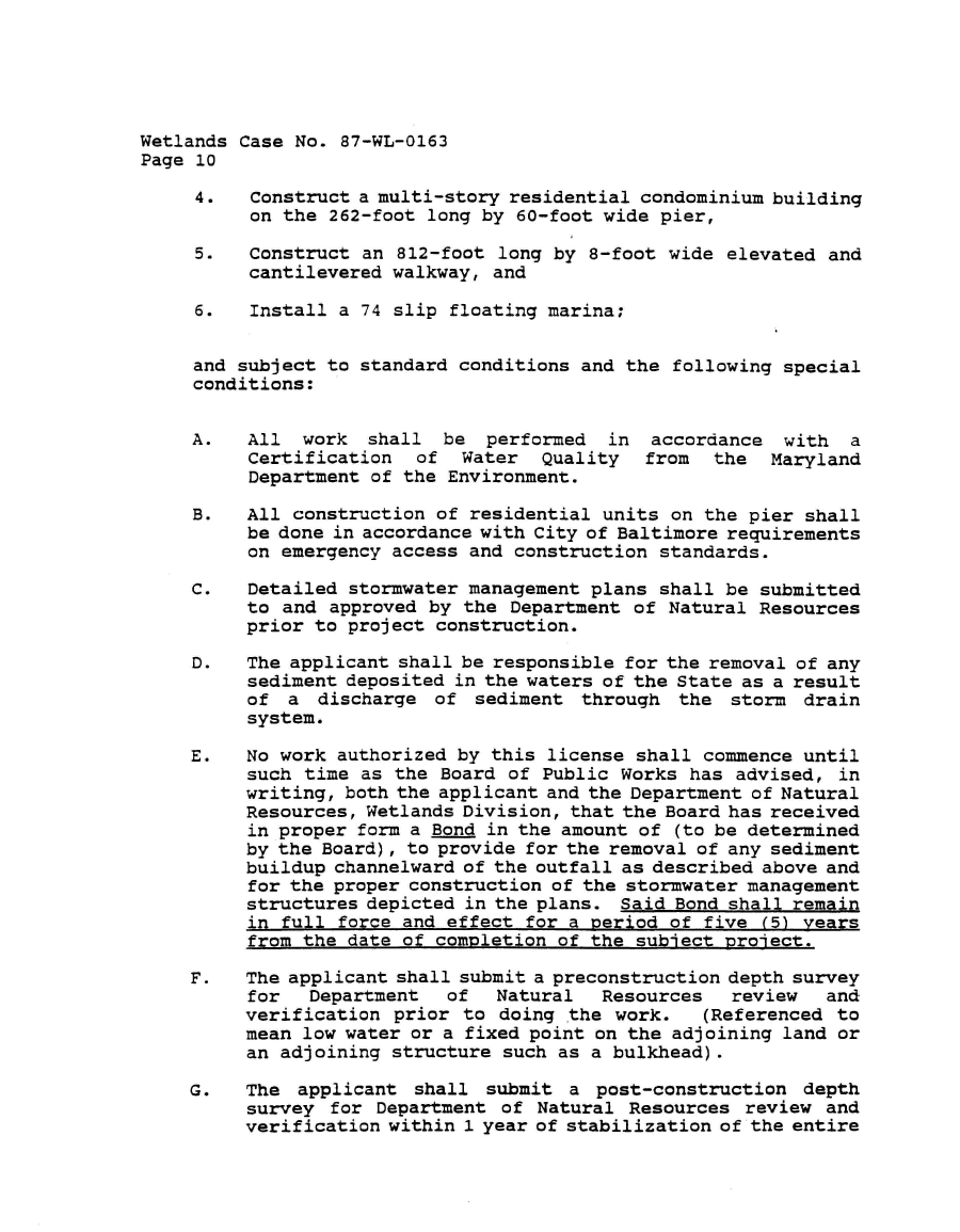 | Wetlands Case No. 87-WL-0163 Page 10 4. Construct a multi-story residential condominium building on the 262-foot long by 60-foot wide pier, 5. Construct an 812-foot long by 8-foot wide elevated and cantilevered walkway, and 6. Install a 74 slip floating marina; and subject to standard conditions and the following special conditions: A. All work shall be performed in accordance with a Certification of Water Quality from the Maryland Department of the Environment. B. All construction of residential units on the pier shall be done in accordance with City of Baltimore requirements on emergency access and construction standards. C. Detailed stormwater management plans shall be submitted to and approved by the Department of Natural Resources prior to project construction. D. The applicant shall be responsible for the removal of any sediment deposited in the waters of the State as a result of a discharge of sediment through the storm drain system. E. No work authorized by this license shall commence until such time as the Board of Public Works has advised, in writing, both the applicant and the Department of Natural Resources, Wetlands Division, that the Board has received in proper form a Bond in the amount of (to be determined by the Board) , to provide for the removal of any sediment buildup channelward of the outfall as described above and for the proper construction of the stormwater management structures depicted in the plans. Said Bond shall remain in full force and effect for a period of five (5) years from the date of completion of the subject project. F. The applicant shall submit a preconstruction depth survey for Department of Natural Resources review and verification prior to doing the work. (Referenced to mean low water or a fixed point on the adjoining land or an adjoining structure such as a bulkhead). G. The applicant shall submit a post-construction depth survey for Department of Natural Resources review and verification within 1 year of stabilization of the entire |
