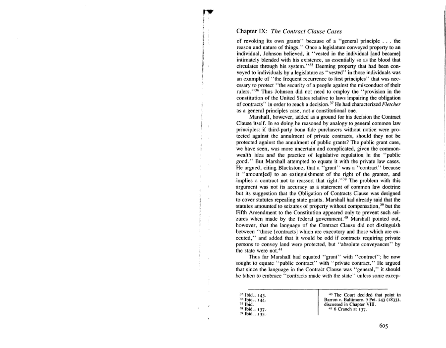 | Chapter IX: The Contract Clause Cases of revoking its own grants" because of a "general principle . . . the reason and nature of things." Once a legislature conveyed property to an individual, Johnson believed, it "vested in the individual [and became] intimately blended with his existence, as essentially so as the blood that circulates through his system."35 Deeming property that had been con- veyed to individuals by a legislature as "vested" in those individuals was an example of "the frequent recurrence to first principles" that was nec- essary to protect "the security of a people against the misconduct of their rulers."36 Thus Johnson did not need to employ the "provision in the constitution of the United States relative to laws impairing the obligation of contracts" in order to reach a decision.37 He had characterized Fletcher as a general principles case, not a constitutional one. Marshall, however, added as a ground for his decision the Contract Clause itself. In so doing he reasoned by analogy to general common law principles: if third-party bona fide purchasers without notice were pro- tected against the annulment of private contracts, should they not be protected against the annulment of public grants? The public grant case, we have seen, was more uncertain and complicated, given the common- wealth idea and the practice of legislative regulation in the "public good." But Marshall attempted to equate it with the private law cases. He argued, citing Blackstone, that a "grant" was a "contract" because it "amounted] to an extinguishment of the right of the grantor, and implies a contract not to reassert that right."38 The problem with this argument was not its accuracy as a statement of common law doctrine but its suggestion that the Obligation of Contracts Clause was designed to cover statutes repealing state grants. Marshall had already said that the statutes amounted to seizures of property without compensation,39 but the Fifth Amendment to the Constitution appeared only to prevent such sei- zures when made by the federal government.40 Marshall pointed out, however, that the language of the Contract Clause did not distinguish between "those [contracts] which are executory and those which are ex- ecuted," and added that it would be odd if contracts requiring private persons to convey land were protected, but "absolute conveyances" by the state were not.41 Thus far Marshall had equated "grant" with "contract"; he now sought to equate "public contract" with "private contract." He argued that since the language in the Contract Clause was "general," it should be taken to embrace "contracts made with the state" unless some excep- 35 Ibid., 143. 36 Ibid., 144. 37 Ibid. 38 Ibid., 137. 39 Ibid., 135. 40 The Court decided that point in Barren v. Baltimore, 7 Pet. 243 (1833), discussed in Chapter VIII. 41 6 Cranch at 137. 605 |