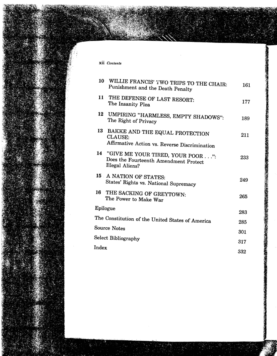 | xii Contents 10 WILLIE FRANCIS' TWO TRIPS TO THE CHAIR: Punishment and the Death Penalty 11 THE DEFENSE OF LAST RESORT: The Insanity Plea 12 UMPIRING "HARMLESS, EMPTY SHADOWS": The Right of Privacy 13 BAKKE AND THE EQUAL PROTECTION CLAUSE: Affirmative Action vs. Reverse Discrimination 14 "GIVE ME YOUR TIRED, YOUR POOR . . .": Does the Fourteenth Amendment Protect Illegal Aliens? 15 A NATION OF STATES: States' Rights vs. National Supremacy 16 THE SACKING OF GREYTOWN: The Power to Make War Epilogue The Constitution of the United States of America Source Notes Select Bibliography Index 161 177 189 211 233 249 265 283 285 301 317 332 |