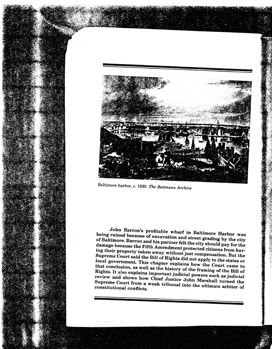 | Baltimore harbor, c. 1830. The Bettmann Archive John Barren's profitable wharf in Baltimore Harbor was being ruined because of excavation and street grading by the city of Baltimore. Barren and his partner felt the city should pay for the damage because the Fifth Amendment protected citizens from hav- ing their property taken away without just compensation. But the Supreme Court said the Bill of Rights did not apply to the states or local government. This chapter explains how the Court came to that conclusion, as well as the history of the framing of the Bill of Rights. It also explains important judicial powers such as judicial review and shows how Chief Justice John Marshall turned the Supreme Court from a weak tribunal into the ultimate arbiter of constitutional conflicts. |