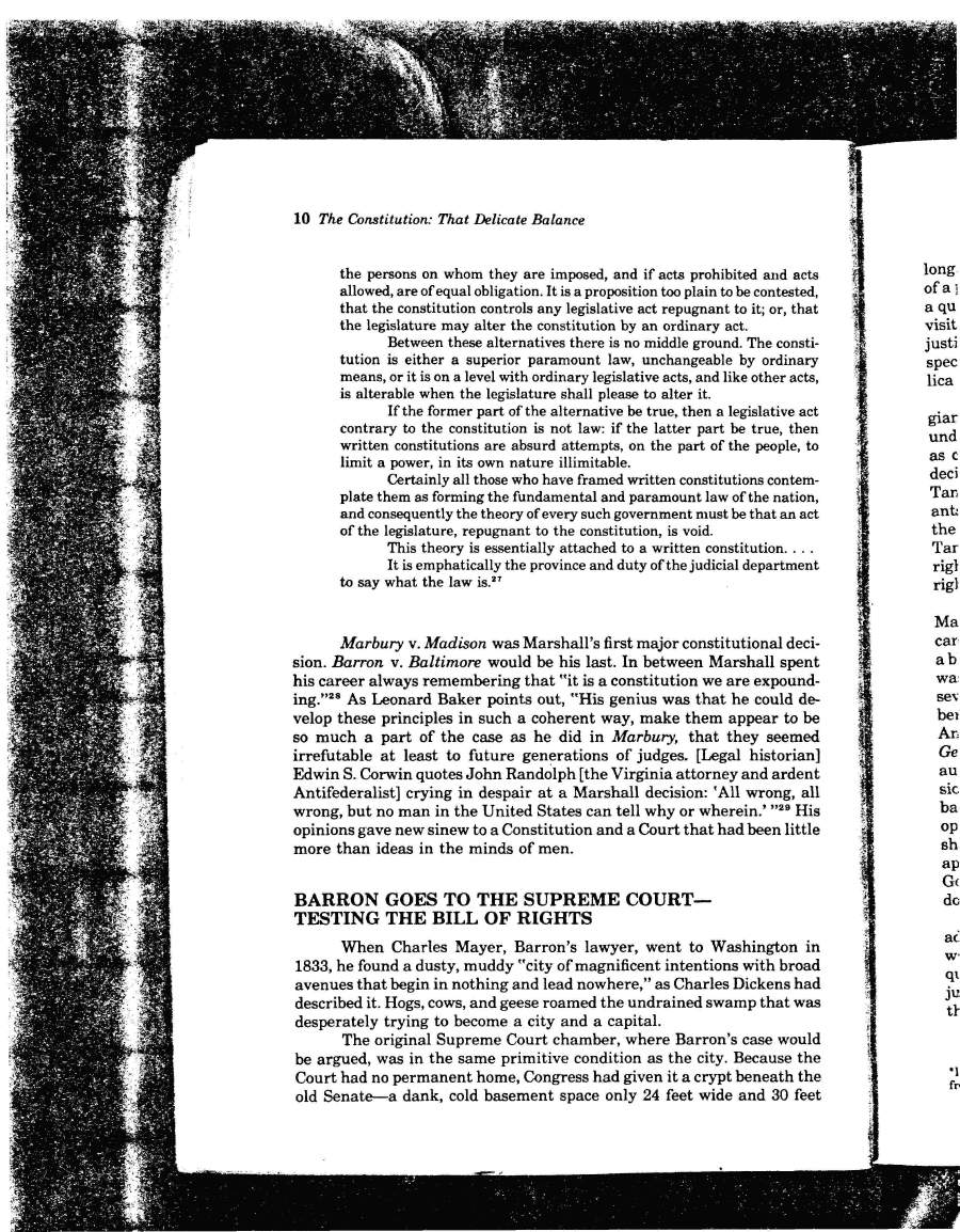 | 10 The Constitution: That Delicate Balance the persons on whom they are imposed, and if acts prohibited and acts allowed, are of equal obligation. It is a proposition too plain to be contested, that the constitution controls any legislative act repugnant to it; or, that the legislature may alter the constitution by an ordinary act. Between these alternatives there is no middle ground. The consti- tution is either a superior paramount law, unchangeable by ordinary means, or it is on a level with ordinary legislative acts, and like other acts, is alterable when the legislature shall please to alter it. If the former part of the alternative be true, then a legislative act contrary to the constitution is not law: if the latter part be true, then written constitutions are absurd attempts, on the part of the people, to limit a power, in its own nature illimitable. Certainly all those who have framed written constitutions contem- plate them as forming the fundamental and paramount law of the nation, and consequently the theory of every such government must be that an act of the legislature, repugnant to the constitution, is void. This theory is essentially attached to a written constitution. . . . It is emphatically the province and duty of the judicial department to say what the law is.27 Marbury v. Madison was Marshall's first major constitutional deci- sion. Barron v. Baltimore would be his last. In between Marshall spent his career always remembering that "it is a constitution we are expound- ing."28 As Leonard Baker points out, "His genius was that he could de- velop these principles in such a coherent way, make them appear to be so much a part of the case as he did in Marbury, that they seemed irrefutable at least to future generations of judges. [Legal historian] Edwin S. Corwin quotes John Randolph [the Virginia attorney and ardent Antifederalist] crying in despair at a Marshall decision: 'All wrong, all wrong, but no man in the United States can tell why or wherein.' "29 His opinions gave new sinew to a Constitution and a Court that had been little more than ideas in the minds of men. BARRON GOES TO THE SUPREME COURT- TESTING THE BILL OF RIGHTS When Charles Mayer, Barren's lawyer, went to Washington in 1833, he found a dusty, muddy "city of magnificent intentions with broad avenues that begin in nothing and lead nowhere," as Charles Dickens had described it. Hogs, cows, and geese roamed the undrained swamp that was desperately trying to become a city and a capital. The original Supreme Court chamber, where Barren's case would be argued, was in the same primitive condition as the city. Because the Court had no permanent home, Congress had given it a crypt beneath the old Senate—a dank, cold basement space only 24 feet wide and 30 feet |
