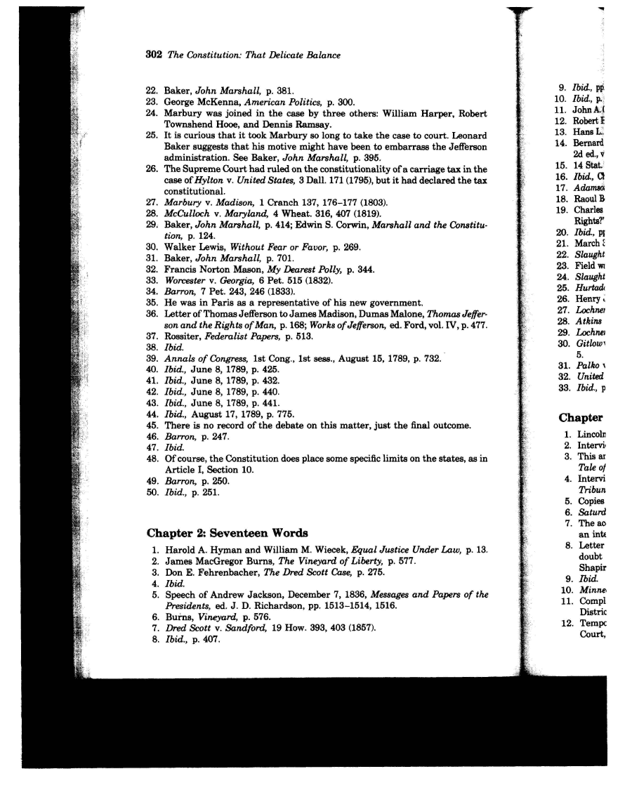 | 302 The Constitution: That Delicate Balance 22. Baker, John Marshall, p. 381. 23. George McKenna, American Politics, p. 300. 24. Marbury was joined in the case by three others: William Harper, Robert Townshend Hooe, and Dennis Ramsay. 25. It is curious that it took Marbury so long to take the case to court. Leonard Baker suggests that his motive might have been to embarrass the Jefferson administration. See Baker, John Marshall, p. 395. 26. The Supreme Court had ruled on the constitutionality of a carriage tax in the case ofHylton v. United States, 3 Ball. 171 (1795), but it had declared the tax constitutional. 27. Marbury v. Madison, 1 Cranch 137, 176-177 (1803). 28. McCulloch v. Maryland, 4 Wheat. 316, 407 (1819). 29. Baker, John Marshall, p. 414; Edwin S. Corwin, Marshall and the Constitu- tion, p. 124. 30. Walker Lewis, Without Fear or Favor, p. 269. 31. Baker, John Marshall, p. 701. 32. Francis Norton Mason, My Dearest Polly, p. 344. 33. Worcester v. Georgia, 6 Pet. 515 (1832). 34. Barron, 7 Pet. 243, 246 (1833). 35. He was in Paris as a representative of his new government. 36. Letter of Thomas Jefferson to James Madison, Dumas Malone, Thomas Jeffer- son and the Rights of Man, p. 168; Works of Jefferson, ed. Ford, vol. IV, p. 477. 37. Rossiter, Federalist Papers, p. 513. 38. Ibid. 39. Annals of Congress, 1st Cong., 1st sess., August 15, 1789, p. 732. 40. Ibid., June 8, 1789, p. 425. 41. Ibid., June 8, 1789, p. 432. 42. Ibid., June 8, 1789, p. 440. 43. Ibid., June 8, 1789, p. 441. 44. Ibid., August 17, 1789, p. 775. 45. There is no record of the debate on this matter, just the final outcome. 46. Barron, p. 247. 47. Ibid. 48. Of course, the Constitution does place some specific limits on the states, as in Article I, Section 10. 49. Barron, p. 250. 50. Ibid., p. 251. Chapter 2: Seventeen Words 1. Harold A. Hyman and William M. Wiecek, Equal Justice Under Law, p. 13. 2. James MacGregor Burns, The Vineyard of Liberty, p. 577. 3. Don E. Fehrenbacher, The Dred Scott Case, p. 275. 4. Ibid. 5. Speech of Andrew Jackson, December 7, 1836, Messages and Papers of the Presidents, ed. J. D. Richardson, pp. 1513-1514, 1516. 6. Burns, Vineyard, p. 576. 7. Dred Scott v. Sandford, 19 How. 393, 403 (1857). 8. Ibid., p. 407. |
