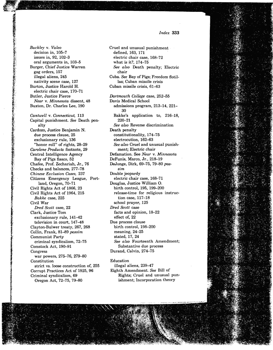 | Index 333 Buckley v. Valeo decision in, 105-7 issues in, 92, 102-3 oral arguments in, 103-5 Burger, Chief Justice Warren gag orders, 157 illegal aliens, 245 nativity scene case, 127 Burton, Justice Harold H. electric chair case, 170-71 Butler, Justice Pierce Near v. Minnesota dissent, 48 Buxton, Dr. Charles Lee, 190 Cantwell v. Connecticut, 113 Capital punishment. See Death pen- alty Cardozo, Justice Benjamin N. due process clause, 25 exclusionary rule, 136 "honor roll" of rights, 28-29 Carolene Products footnote, 29 Central Intelligence Agency Bay of Pigs fiasco, 52 Chafee, Prof. Zechariah, Jr., 76 Checks and balances, 277-78 Chinese Exclusion Cases, 237 Citizens Emergency League, Port- land, Oregon, 70-71 Civil Rights Act of 1866, 23 Civil Rights Act of 1964, 215 Bakke case, 225 Civil War Dred Scott case, 22 Clark, Justice Tom exclusionary rule, 141-42 television in court, 147-48 Clayton-Bulwer treaty, 267, 268 Collin, Frank, 81-89 passim Communist Party criminal syndicalism, 72-75 Comstock Act, 190-91 Congress war powers, 275-76, 279-80 Constitution strict vs. loose construction of, 255 Corrupt Practices Act of 1925, 96 Criminal syndicalism, 69 Oregon Act, 72-75, 79-80 Cruel and unusual punishment denned, 163, 171 electric chair case, 168-72 what is it?, 174-75 See also Death penalty; Electric chair Cuba. See Bay of Pigs; Freedom flotil- las; Cuban missile crisis Cuban missile crisis, 61-63 Dartmouth College case, 252-55 Davis Medical School admissions program, 213-14, 221- 30 Bakke's application to, 216-18, 220-21 See also Reverse discrimination Death penalty constitutionality, 174-75 electrocution, 162-63 See also Cruel and unusual punish- ment; Electric chair Defamation. See Near v. Minnesota DeFunis, Marco, Jr., 218-19 DeJonge, Dirk, 69-75, 79-80 pas- sim Double jeopardy electric chair case, 168-71 Douglas, Justice William O. birth control, 195, 199-200 release-time for religious instruc- tion case, 117-18 school prayer, 125 Dred Scott case facts and opinion, 18-22 effect of, 22 Due process clause birth control, 198-200 meaning, 24-25 stated, 17, 24 See also Fourteenth Amendment; Substantive due process Durand, Calvin, 274-75 Education illegal aliens, 239-47 Eighth Amendment. See Bill of Rights; Cruel and unusual pun- ishment; Incorporation theory |