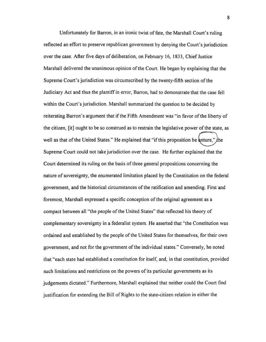 | 8 Unfortunately for Barren, in an ironic twist of fate, the Marshall Court's ruling reflected an effort to preserve republican government by denying the Court's jurisdiction over the case. After five days of deliberation, on February 16, 1833, Chief Justice Marshall delivered the unanimous opinion of the Court. He began by explaining that the Supreme Court's jurisdiction was circumscribed by the twenty-fifth section of the Judiciary Act and thus the plantiff in error, Barron, had to demonstrate that the case fell within the Court's jurisdiction. Marshall summarized the question to be decided by reiterating Barren's argument that if the Fifth Amendment was "in favor of the liberty of the citizen, [it] ought to be so construed as to restrain the legislative power of the state, as well as that of the United States." He explained that "if this proposition be imture,"/lhe Supreme Court could not take jurisdiction over the case. He further explained that the Court determined its ruling on the basis of three general propositions concerning the nature of sovereignty, the enumerated limitation placed by the Constitution on the federal government, and the historical circumstances of the ratification and amending. First and foremost, Marshall expressed a specific conception of the original agreement as a compact between all "the people of the United States" that reflected his theory of complementary sovereignty in a federalist system. He asserted that "the Constitution was ordained and established by the people of the United States for themselves, for their own government, and not for the government of the individual states." Conversely, he noted that "each state had established a constitution for itself, and, in that constitution, provided such limitations and restrictions on the powers of its particular governments as its judgements dictated." Furthermore, Marshall explained that neither could the Court find justification for extending the Bill of Rights to the state-citizen relation in either the |
