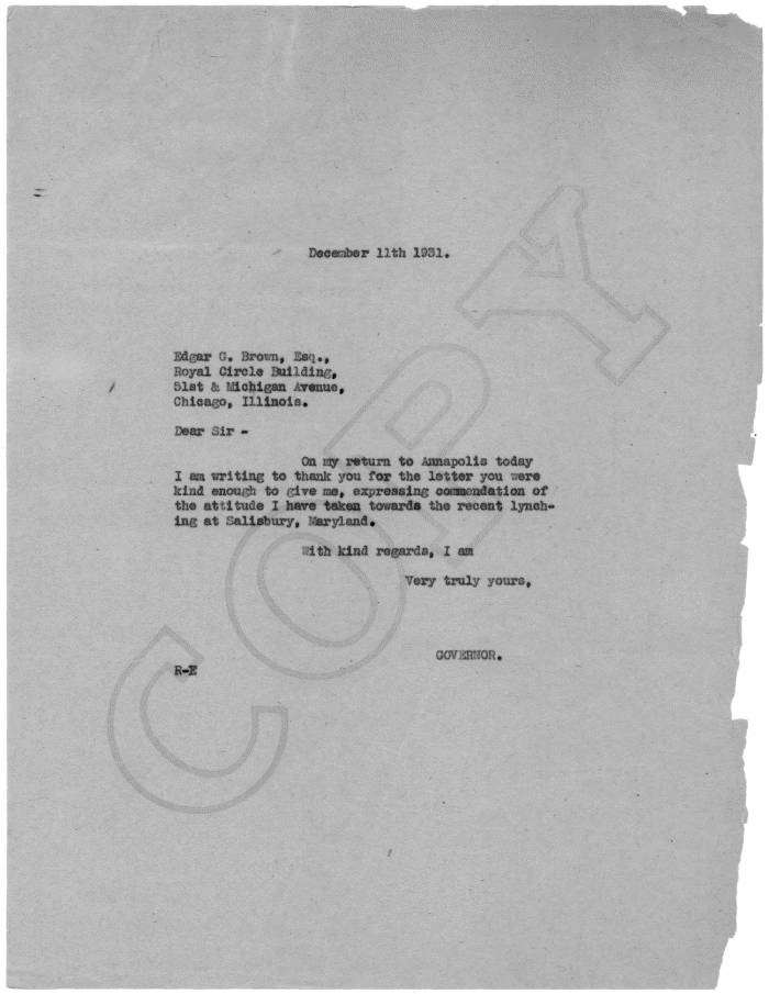 | Deceeiber 11th 1931. Edgar G. Brora, Saq., Royal Circle Building, 51st & ?Jichigan Avenue, Chicago, Illinois. Dear Sir - On ray return to Annapolis today I am -writing to thank you for the letter you ./ere kind enough to give me, expressing coEaaendatlon of the attitude I have taken toward* the recent lynch ing at Salisbury, Maryland. /ith kind regards, I am Very truly yours, GOVERNOR. R-E / |