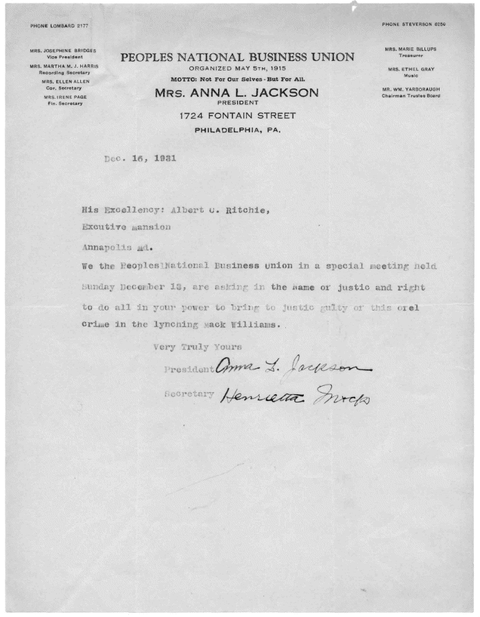 | PHONE LOMBARD 2177 PHONE STEVERSON 6250 MRS. JOSEPHINE BRIDGES Vice President MRS. MARTHA M. J. HARRIS Recording Secretary MRS. ELLEN ALLEN Cor. Secretary MRS. IRENE PAGE fin. Secretary PEOPLES NATIONAL BUSINESS UNION ORGANIZED MAY 5th, 1915 MOTTO: Not For Our Selves - But For All. MRS. ANNA L. JACKSON PRESIDENT 1724 FONTAIN STREET PHILADELPHIA, PA. MRS. MARIE BILLUPS Treasurer MRS. ETHEL GRAY Music MR. WM. YARBORAUGH Chairman Trustee Board . lfl, 1931 His Excellency: Albert o*. Ritchie* iuxcutiTo Mansion Annapolis m • We the ifeoplcs j:ationr I Buslnaaa union in a special me• ting nelcl Sunday December i«, ar< ij the i»ame or justic and right to do all in your power to bring to juntic gul/ty < i el crime in the lynching vack Williams. Very Truly Yours idant&W*^- ^ Mfr*4&6 •resii " JxM^^oZ^C. ^TVrcfa |