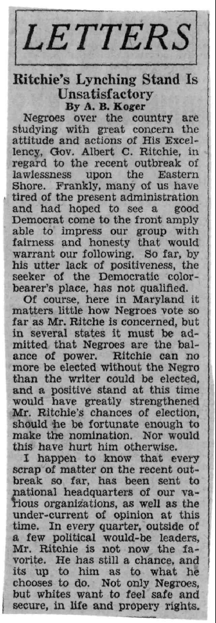 | LETTERS Ritchie's Lynching Stand Is Unsatisfactory By A. B. Koger Negroes over the country are studying with great concern the attitude and actions of His Excellency, Gov. Albert C. Ritchie, in regard to the recent outbreak of lawlessness upon the Eastern Shore. Frankly, many of us have tired of the present administration and had hoped to see a good Democrat come to the front amply able to impress our group with fairness and honesty that would warrant our following. So far, by his utter lack of positiveness, the seeker of the Democratic color-bearer's place, has not qualified. Of course, here in Maryland it matters little how Negroes vote so far as Mr. Ritche is concerned, but in several states it must be admitted that Negroes are the balance of power, Ritchie can no more be elected without the Negro than the writer could be elected, and a positive stand at this time would have greatly strengthened Mr. Ritchie's chances of election, should he be fortunate enough to make the nomination. Nor would this have hurt him otherwise. I happen to know that every scrap of matter on the recent outbreak so far, has been sent to national headquarters of our various organizations, as well as the under-current of opinion at this time. In every quarter, outside of a few political would-be leaders, Mr. Ritchie is not now the favorite. He has still a chance, and its up to him as to what he chooses to do. Not only Negroes, but whites want to feel safe and secure, in life and propery rights. |
